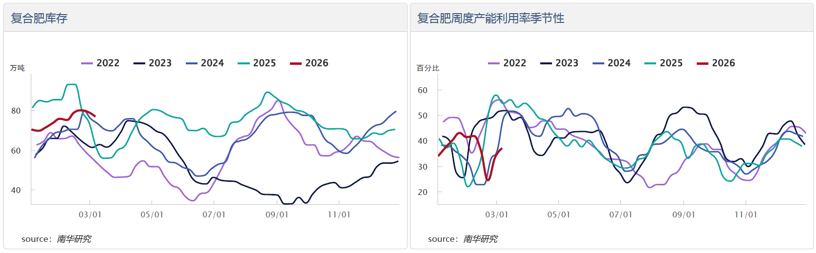 三、问题分析与逻辑推演 1、需求前置效应的验证 调研中发现的两个现象值得关注:一是农户年前采购冬小麦肥料比例较高,二是经销商年前就开始大量备货。这两个现象共同指向一个问题——需求存在明显前置。 从时间维度看,年前的采购行为实际上透支了年后的追肥需求。正常情况下,冬小麦追肥需求应集中在2月下旬至3月中旬释放,但由于年前采购比例较高,导致节后追肥期间的新增需求减少。这解释了为什么当前追肥季节中,市场并未出现预期的采购高峰。 从空间维度看,鲁南地区年前采购比例高于鲁中地区,与该区域追肥结束时间较早形成对应。即年前采购比例越高的区域,追肥季节结束越早,需求透支效应越明显。 复合肥企业提前生产4、5月高氮玉米肥的行为,同样是一种生产端的需求前置。这种行为导致复合肥成品过早进入市场,而下游销售不畅则使成品滞留在厂库和渠道中,形成库存积压。 2、复合肥“压力雷区”的形成机制 复合肥行业“成品+原料”双高库存的形成,是多重因素叠加的结果。 生产端:企业基于对春耕需求的乐观预期,提前启动高氮玉米肥生产,导致成品库存提前累积。同时,企业为锁定原料成本,在价格相对低位时大量采购尿素等原料,形成原料库存和大量在途货物。 渠道端:经销商年前备货积极,采购量较大,但目前仓库已接近饱和,无力继续承接上游货物。渠道库存的高企,使得复合肥企业成品出货通道受阻。 需求端:农户采购前置、价格敏感、等待心态等因素共同作用,导致终端需求释放节奏放缓。追肥需求逐步收尾后,短期内难以看到新的需求增长点。 这三个环节相互强化,形成库存压力的正向循环:终端需求放缓→经销商库存积压→复合肥企业成品销售困难→企业被动减产→原料采购需求下降→尿素等原料价格承压。这一循环一旦形成,就可能演变为市场风险引爆点。 3、尿素基本面分析 (1)供应端:日产量创历史新高 当前尿素行业开工率维持高位,日产量已突破22万吨,处于历史新高水平。高供应主要得益于:一是行业扩能周期延续,新增产能陆续释放;二是气头装置开工率回升,冬季限产影响消退;三是企业利润尚可,生产积极性较高。 供应端的持续高位运行,对尿素价格形成根本性压制。在当前需求相对疲软的背景下,高供应意味着库存累积压力将持续存在。 (2)需求端:农业与工业双重承压 农业需求方面,随着冬小麦追肥季节收尾,农需正步入空档期。下一轮集中需求要等到4月中下旬玉米播种用肥启动,期间存在一个多月的需求真空期。 工业需求方面,复合肥企业受制于成品高库存,开工率可能逐步下调,对尿素的采购需求将随之减弱。调研中已有复合肥企业表示,将根据成品销售情况动态调整开工率,短期内没有新增原料采购计划。 (3)政策端:限价明确,调控持续 政策面对尿素价格的引导作用十分明确。国内尿素现货限价1840元/吨左右,36月份指导价维持不变。调研中经销商普遍反映,政策信号的清晰传递,有效稳定了市场预期,抑制了投机性需求。 (4)国际因素:地缘影响传导不畅 受伊朗局势影响,国际尿素装置出现减产现象,国际尿素价格近期上涨明显。但从盘面表现看,国内尿素期货对国际地缘因素的敏感度较低,价格反应较为平淡。这表明当前国内市场的定价核心仍在于政策端和国内基本面,国际因素的传导路径不够通畅。