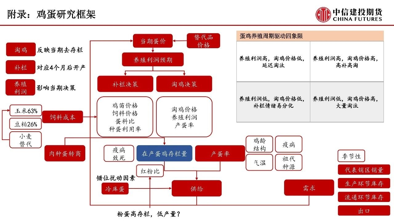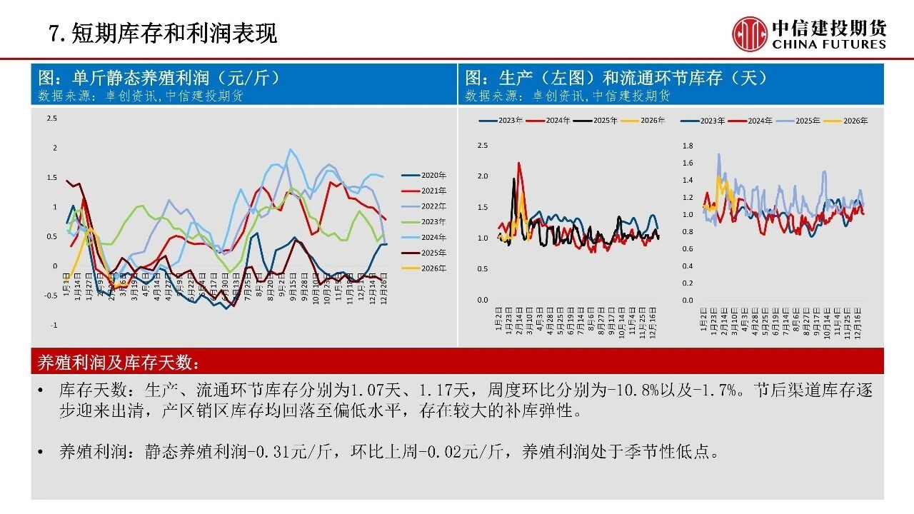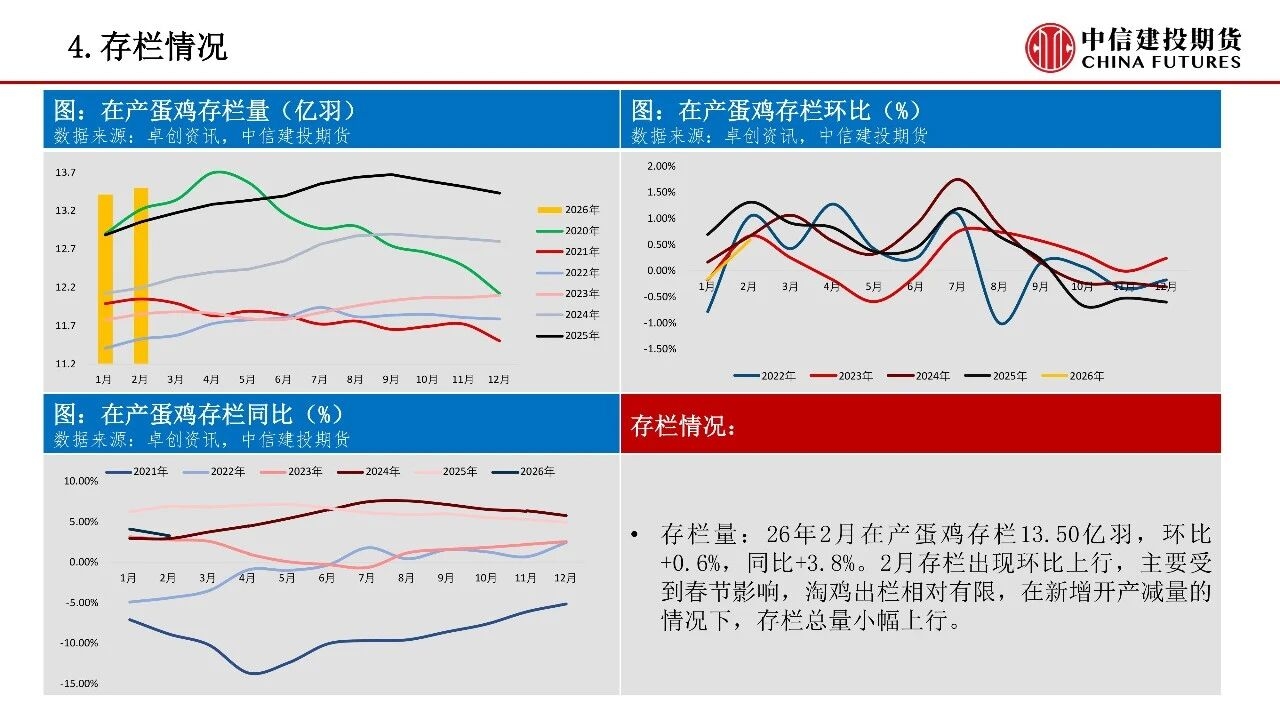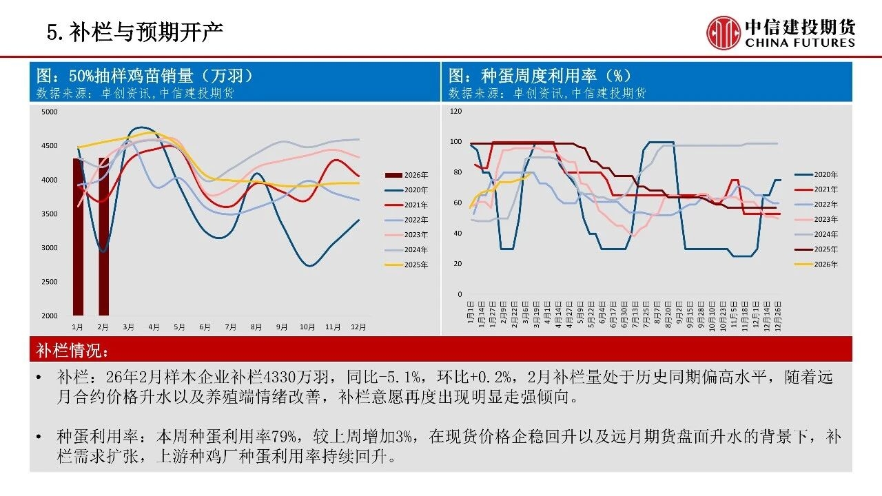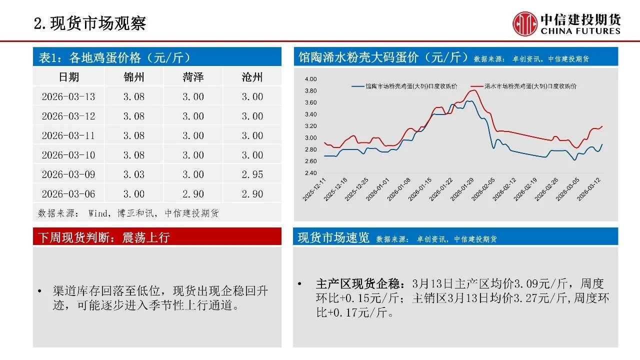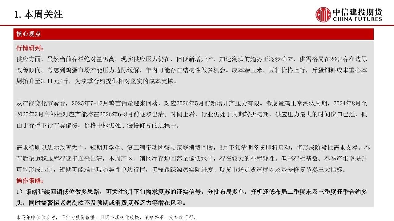 | 供应方面,虽然当前存栏绝对量仍高,现实供应压力仍在,但低新增开产、加速淘汰的趋势正逐步确立,供需格局在26Q2存在边际改善倾向。考虑到鸡蛋市场产能压力边际缓解,年内可能存在结构性做多机会。成本端玉米、豆粕价格上行,斤蛋饲料成本重心本周抬升至3.11元/斤,为淡季合约提供相对坚实的成本支撑。 从产能变化节奏看,2025年7-12月鸡苗销量迎来回落,对应2026年5月前新增开产压力有限。考虑蛋鸡正常淘汰周期,2024年8月至2025年3月高补栏对应产能将在2026年6-8月前逐步出清。时间上看,行业仍处于周期转折初期,供应压力最大的时间窗口已过,但由于存栏下行节奏偏缓,价格中枢仍处于缓慢修复的过程中。 需求端则以边际改善为主,短期开学季、复工潮带动团餐与家庭消费回暖,3月下旬清明备货即将启动,将形成阶段性需求支撑。春节后渠道积压库存逐步迎来出清,本周产区、销区库存均回落至偏低水平,存在较大的补库弹性。但高存栏基数、春季产蛋率提升可能形成压制,短期可能难出现趋势性单边行情,仍需跟踪淘鸡实际进度、现货市场走货速度以及基差修复节奏三大指标。 操作策略:1)策略延续回调低位做多思路,可关注3月下旬需求复苏的证实信号,分批布局多单,择机逢低布局二季度末及三季度旺季合约多头,同时需警惕老鸡淘汰不及预期或消费复苏乏力等潜在风险。