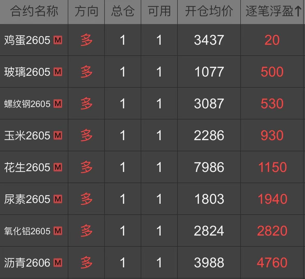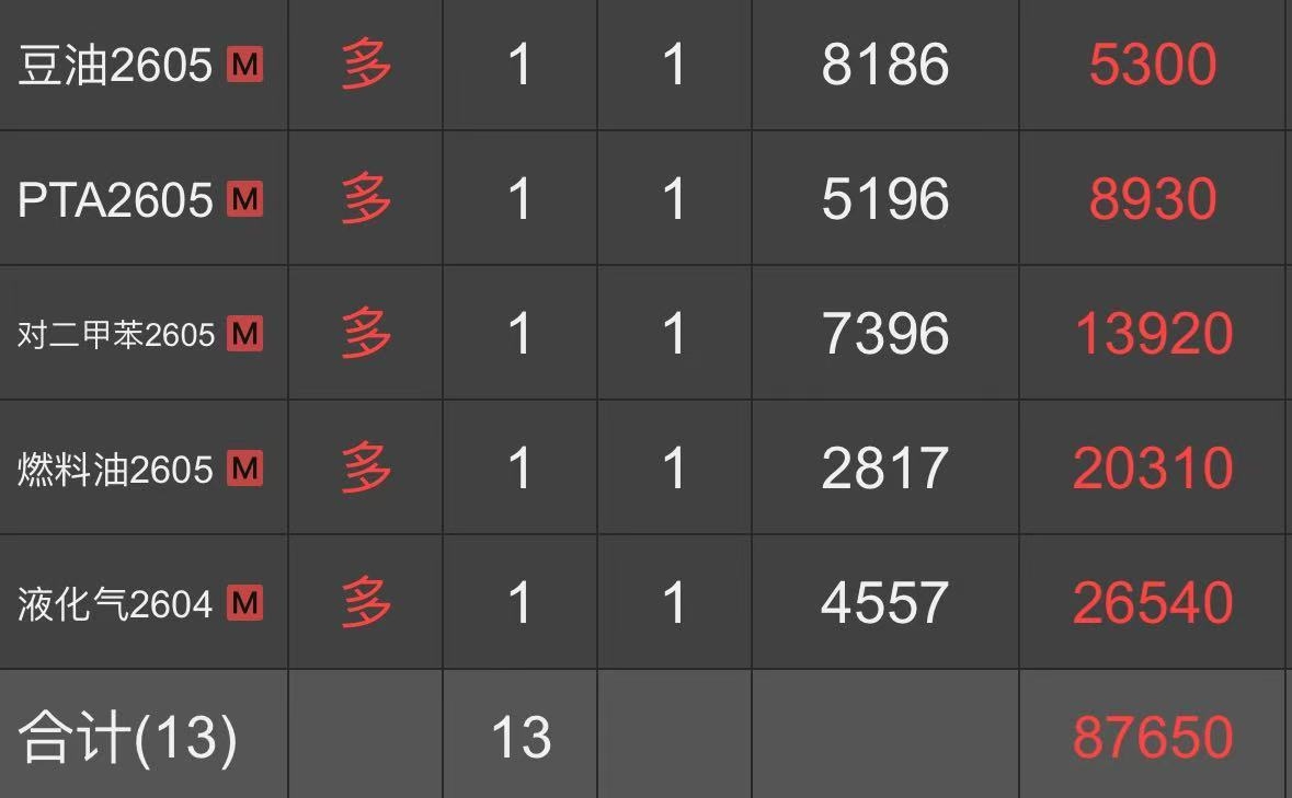 | 一、开仓总结 燃料油:2026年1月9日,达到启动点的开仓条件,所以在14:56开多一手燃料油2603合约,开仓价为2514。燃料油2603合约于2026年2月5日21:35移仓至主力合约2605,开仓价为2817。 PTA:2026年2月10日,达到启动点的开仓条件,所以在14:53开多一手PTA2605合约,开仓价为5230。 玉米:2026年2月10日,达到启动点的开仓条件,所以在14:53开多一手玉米2605合约,开仓价为2286。 尿素:2026年2月11日,达到启动点的开仓条件,所以在14:42开多一手尿素2605合约,开仓价为1803。 沥青:2026年2月25日,达到启动点的开仓条件,所以在14:50开多一手沥青2604合约,开仓价为3359。沥青2604合约于2026年3月12日14:41移仓至主力合约2606,开仓价为3988。 豆油:2026年2月26日,达到启动点的开仓条件,所以在14:45开多一手豆油2605合约,开仓价为8186。 液化气:2026年2月26日,达到启动点的开仓条件,所以在14:45开多一手液化气2604合约,开仓价为4557。 对二甲苯:2026年2月27日,达到启动点的开仓条件,所以在14:53开多一手对二甲苯2605合约,开仓价为7396。 氧化铝:2026年3月6日,达到启动点的开仓条件,所以在14:46开多一手氧化铝2605合约,开仓价为2824。 螺纹钢:2026年3月6日,达到启动点的开仓条件,所以在14:47开多一手螺纹钢2605合约,开仓价为3087。 玻璃:2026年3月10日,达到启动点的开仓条件,所以在14:57开多一手玻璃2605合约,开仓价为1077。 花生:2026年3月10日,达到启动点的开仓条件,所以在14:59开多一手花生2605合约,开仓价为7986。 鸡蛋:2026年3月16日,达到启动点的开仓条件,所以在14:56开多一手鸡蛋2605合约,开仓价为3437。