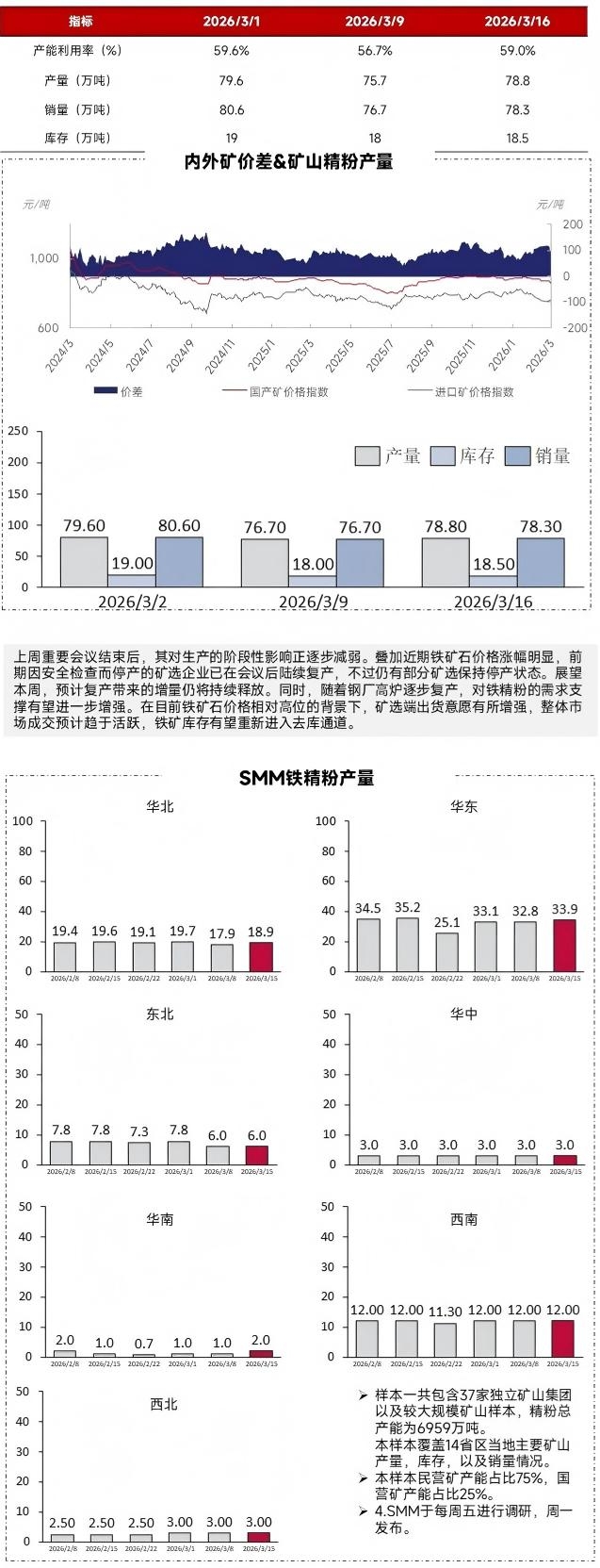 | 报告品种:铁矿石 原文链接:https://mp.weixin.qq.com/s/J5mSFHFXacYJBPBjTOUKnQ 根据SMM的最新统计,本周国内矿山整体产能利用率为59%,较前一周提升2.3个百分点。铁精粉产量达到78.8万吨,环比增加3.1万吨;与此同时,矿山精粉库存微增0.5万吨,目前维持在18.5万吨左右。 上周重要会议结束后,其对生产的阶段性影响正逐步减弱。叠加近期铁矿石价格涨幅明显,前期因安全检查而停产的矿选企业已在会议后陆续复产,不过仍有部分矿选保持停产状态。展望本周,预计复产带来的增量仍将持续释放。同时,随着钢厂高炉逐步复产,对铁精粉的需求支撑有望进一步增强。在目前铁矿石价格相对高位的背景下,矿选端出货意愿有所增强,整体市场成交预计趋于活跃,铁矿库存有望重新进入去库通道。