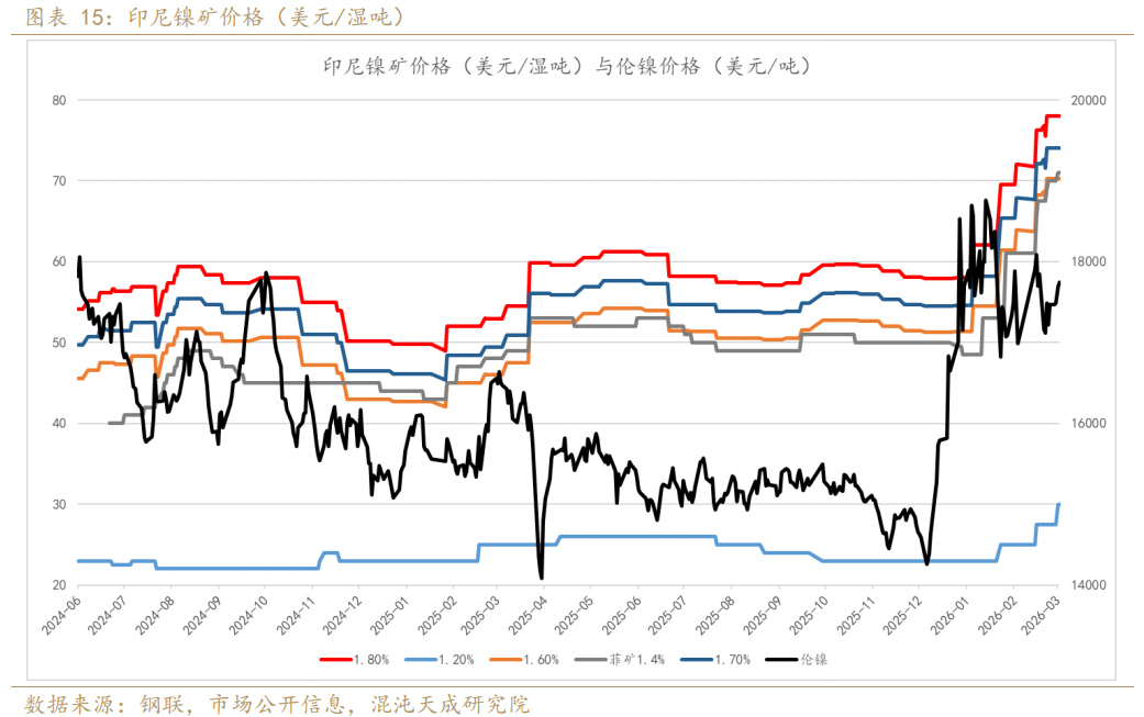 印尼拟削减2026年镍矿生产配额是支撑镍价底部估值抬升的主要驱动,目前印尼批准的镍矿RKAB配额在2.6-2.7亿吨之间,印尼通过削减配额调控镍矿供应以支撑镍价的逻辑延续,目前当地仍处斋月,预计短期不会有新的配额释放,镍矿供应仍偏紧张,镍矿价格持稳上行,成本端对镍价形成支撑,在成本支撑和供应扰动预期下,镍仍有低多的性价比。