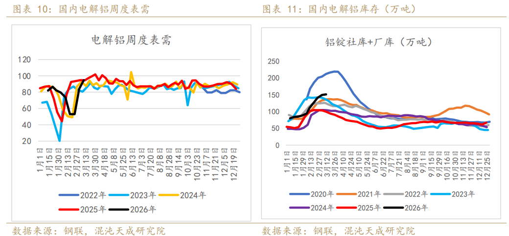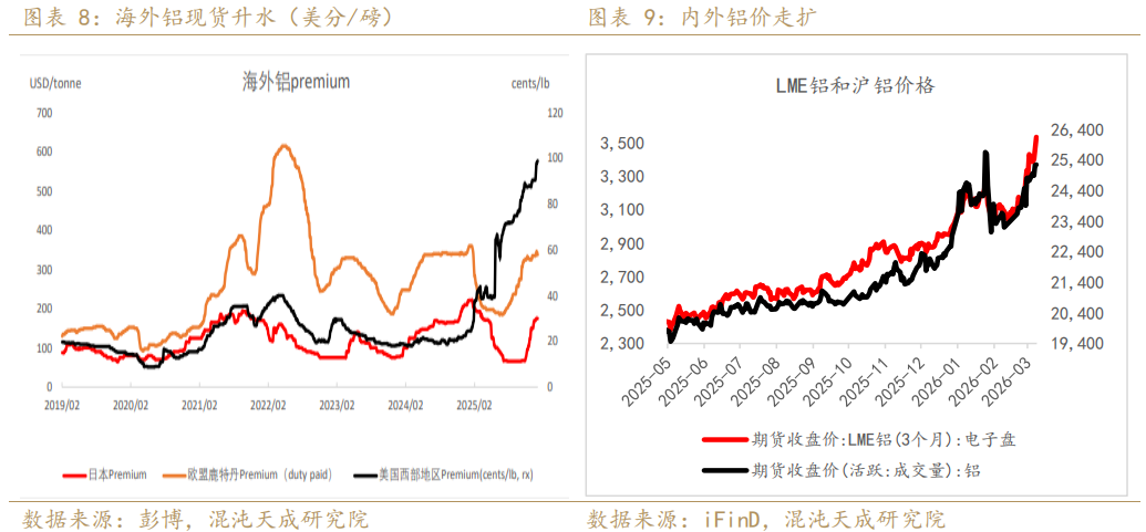 从中东地区电解铝消费来看,2025年合计消费量约193万吨,接近500万吨的电解铝是用于出口的,从中东电解铝贸易运输流向来看,中东地区原铝主要出口欧盟、美国、日韩,如因霍尔木兹海峡封锁形成供应断裂,海外铝价会应声上涨,海外现货升水上行,lme库存低位下行,都反应出了海外供应的紧张,且随着供应断裂风险确定性增强,海外会有提前囤货的行为,也会增加海外挤仓的风险。而我国与中东在电解铝贸易关联度底,2025年从中东进口电解铝几无,实际对国内供应冲击小,海外铝价上行需要时间传导。同时国内电解铝出口需要征收30%的出口关税,国内铝在出口窗口并未开启的情况下并不会出口,所以铝的内外价差短期是在走扩的。
