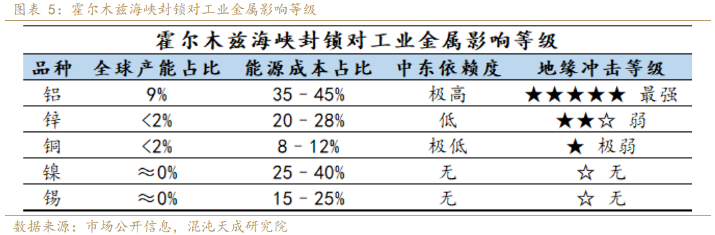 2、运输通道被封锁,供应出现扰动(电解铝和镍)。 美伊爆发热战冲突以来,霍尔木兹海峡处于实质被封锁的状态,商业航运近乎瘫痪,当前处于仅少数豁免船只通行的极端状态,如果持续封锁,会造成中东地区进出口运输被停滞,工业生产原材料无法进入,工业产成品无法出口,会造成部分工业品供应下行。我们梳理之后发现,如霍尔木兹海峡被持续封锁,对工业金属影响最大的品种是铝和镍(中东是硫磺出口大国)。