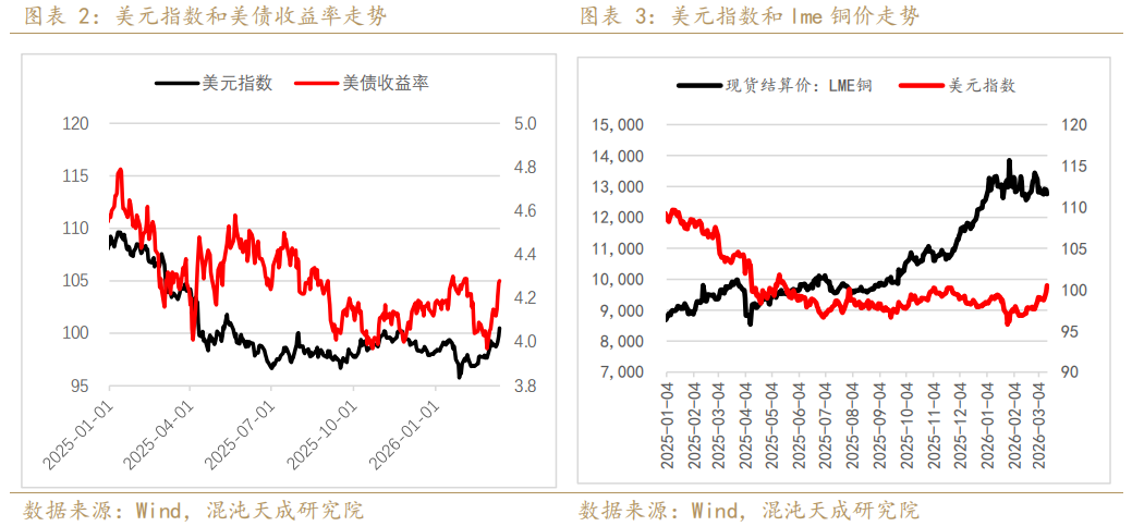 二、基本金属的传导路径:宏观偏空叠加供应冲击和能源成本抬升 化工板块的是基于能源成本抬升和供应扰动的逻辑跟随原油大涨,影响路径:中东出口中断-中东原油供应短缺-亚洲炼厂持续降负-芳烃烯烃短缺-下游化工被动停车-价格上升传导-需求弹性。基本金属的传导逻辑也基本是这两条路径,同时会衍生出更支线的影响,比如油价上涨推升海运费上涨致生产成本推高,我们从传导路径去分析地缘冲突事件对于基本金属的影响。 1、首先是对宏观的影响:全球流动性挤压+全球总需求受限 中东地缘冲突爆发之前,宏观环境处于宽松周期带来的美元指数和美债利率走低形成流动性支撑环境,能源绿色化和AI智能化叙事带动相关金属需求预期向好,相对受限的供应增量受到投机资金青睐,价格整体呈现上行趋势。中东地缘冲突爆发后,地缘风险的上行使得原油价格暴涨推升通胀预期,降息预期回落使得债券利率上抬,美债利率和美元指数持续冲高抑制市场流动性,此前的宽松环境出现一定程度的反转。同时,相对升高的利率水平使得全球权益市场承压,特别是此前上行明显的科技AI板块,需求出现明显下行预期。所以,宏观环境对于基本金属来说是偏空的。