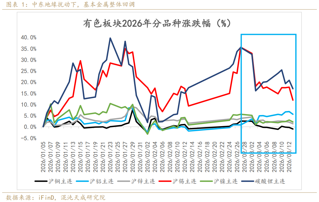 | 一、中东地缘扰动下,基本金属整体回调 首先从我们年初给的基本金属年报总结来看,基于能源绿色化和AI智能化的长期需求叙事,叠加供应端增量有限且易出扰动,我们对于供需紧平衡的品种铜、铝和锡给出了全年低多的交易思路,但短期基本金属呈现出回调的走势,主要原因在于中东地缘事件的冲击,我们认为在此事件冲击影响下,全球流动性宽松的环境被挤压,总需求也受到限制,宏观处于上行驱动走弱,需求叙事受到冲击的阶段,所以我们认为在事件冲击未结束之前,铜和锡以观察为主,铝和镍由于供应端有大幅缩减的可能,且下方存在支撑,我们认为仍可逢低试多。当前商品交易主线围绕中东地缘扰动展开,我们从事件传导的角度聊聊对于基本金属当前的看法。 事件回顾:2026年2月28日,美以联合对伊朗发动精准斩首与全域空袭,触发伊朗全面反击,向以色列及海湾地区美国军事基地实施打击,并严控霍尔木兹海峡船只通行。