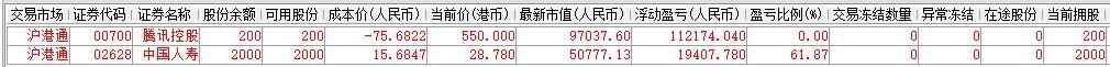 | 账户初始资金:100000.00元 2015年5月18日入金:32000.00元 2015年5月29日入金:9000.00元 2015年6月23日入金:20000.00元 2015年6月26日入金:10000.00元 2015年6月29日入金:20000.00元 2015年7月3日入金:20000.00元 2015年7月8日入金:10000.00元 2016年1月12日入金:90000.00元 2016年1月22日入金:100000.00元 2016年1月27日入金:100000.00元 2016年3月21日出金:270000.00元 2016年4月12日出金:35639.23元 2016年0月10日出金:56913.08元 2016年10月28日入金:60000.00元 2017年3月7日出金:113800.00元 参考市值:168875.73元 账户资产:169277.81元 截至今日账户A股盈亏:-41558.36元 截至今日账户港股盈亏:126514.4元 账户净值:1.895 资金股份