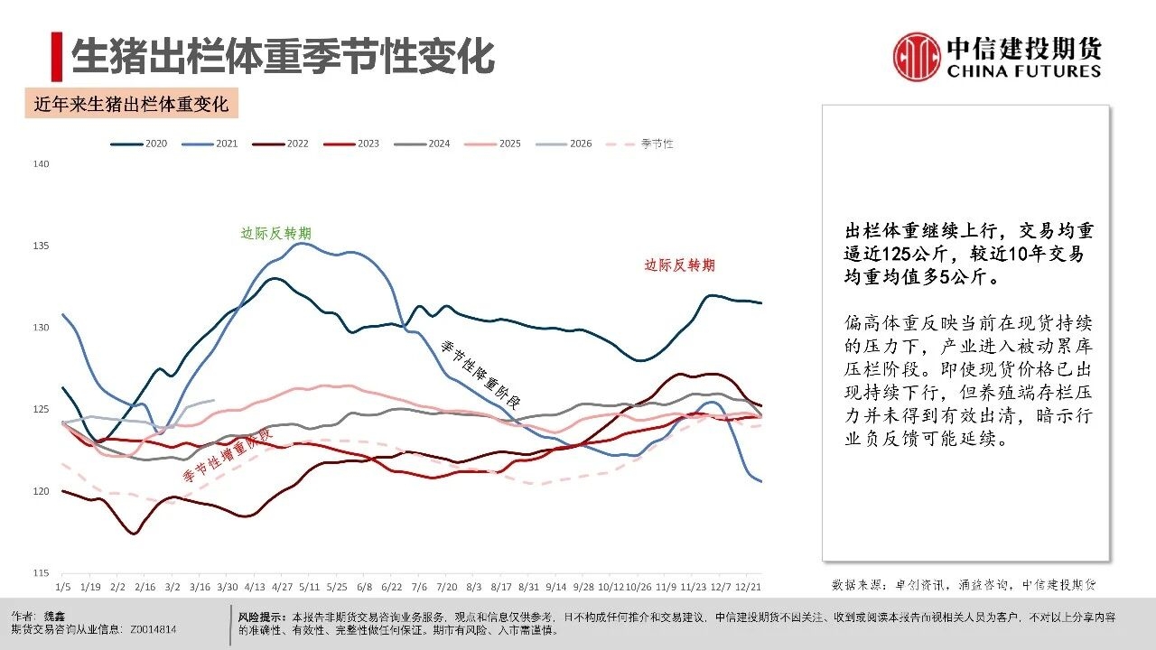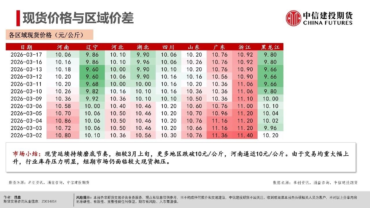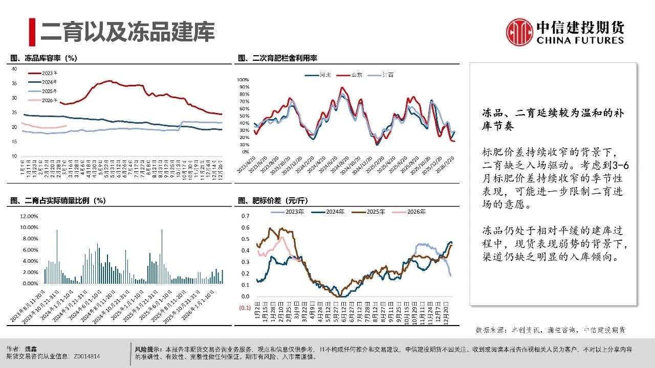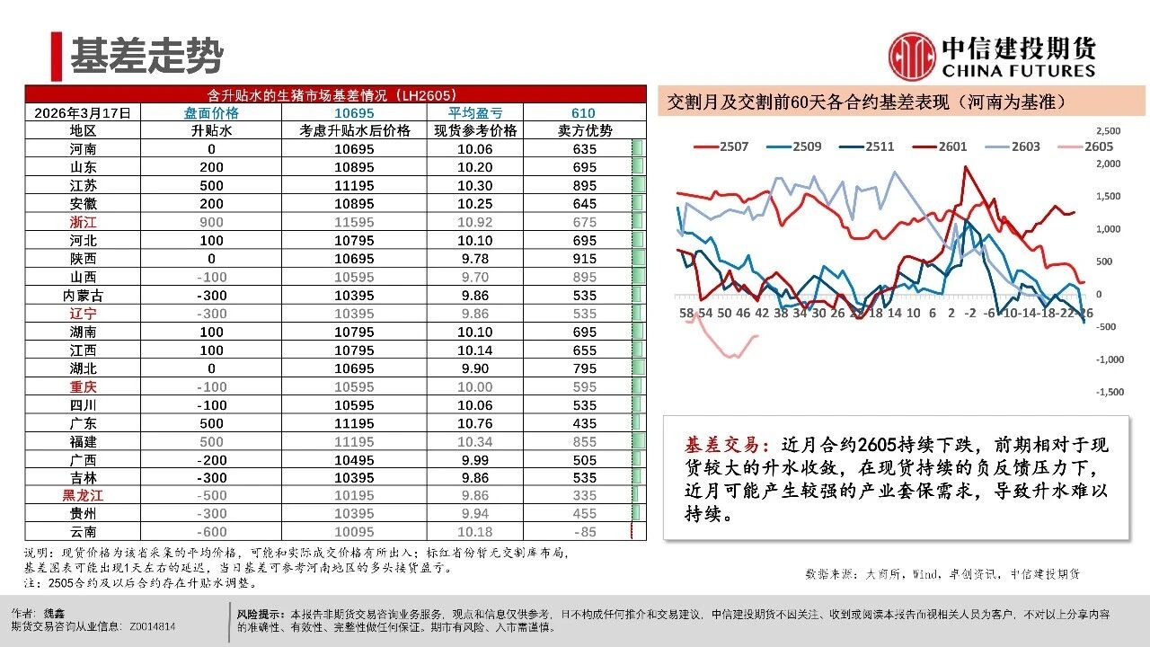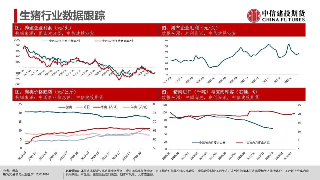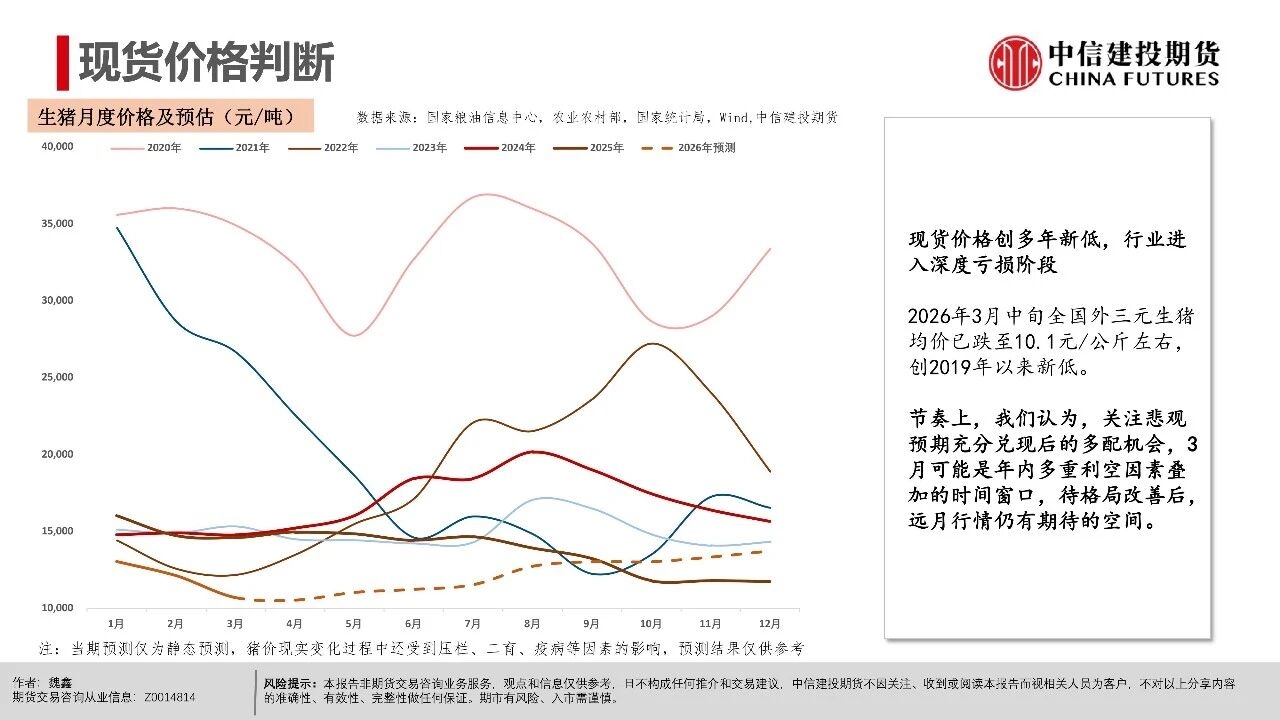 | 近期生猪现货延续磨底探底状态,行业现货价格负反馈延续,相较3月上旬,更多地区跌破10元/公斤,河南地区均价10.06元/公斤,逐步逼近10元/公斤。对近端逻辑而言,值得警惕的是出栏交易均重继续上行,本周交易均重124.6公斤,较近10年交易均重均值多出5公斤。 偏高体重反映当前在现货持续的压力下,产业进入被动累库压栏阶段。但压栏和累库的动作并未带来现货价格的提振,养殖端存栏压力并未得到有效出清,却面临价格降以及库存升的被动局面,或暗示行业负反馈可能延续。 交易思路上,近月与远月逻辑出现明显分化。近月合约2605本周持续下跌,前期相对现货的升水出现收敛。我们认为,在现货持续的负反馈压力下,近月可能产生较强的产业套保对冲需求,导致近月盘面升水难以持续。从需求承接看,冻品、二育延续较为温和的补库节奏。 时间上,考虑到3-6月标肥价差持续收窄的季节性表现,可能进一步限制二育进场的意愿。在产业整体心态比较谨慎的背景下,可能要看到现货出现相对积极的表现后,承接力量才可能集中入场。 中期逻辑上,现货价格创多年新低,行业进入深度亏损阶段。我们认为,远月合约侧重产能去化加速与政策效果预期,尽量关注悲观预期充分兑现后的多配机会,3月可能是年内多重利空因素叠加的时间窗口,待格局改善后,远月行情仍有期待的空间。市场可能在弱势现货表现下逐步打开产能去化空间,给出远月更多向上的空间。 操作策略:(1)养殖套保盘谨慎应对远月行情,考虑预留更多安全边际。26Q3供给曲线指引偏积极,交易题材方面可进一步关注能繁母猪去化情况,远月合约2611、2701持续关注升水收敛后低位多配机会,但也需注意产能去化不及预期风险。