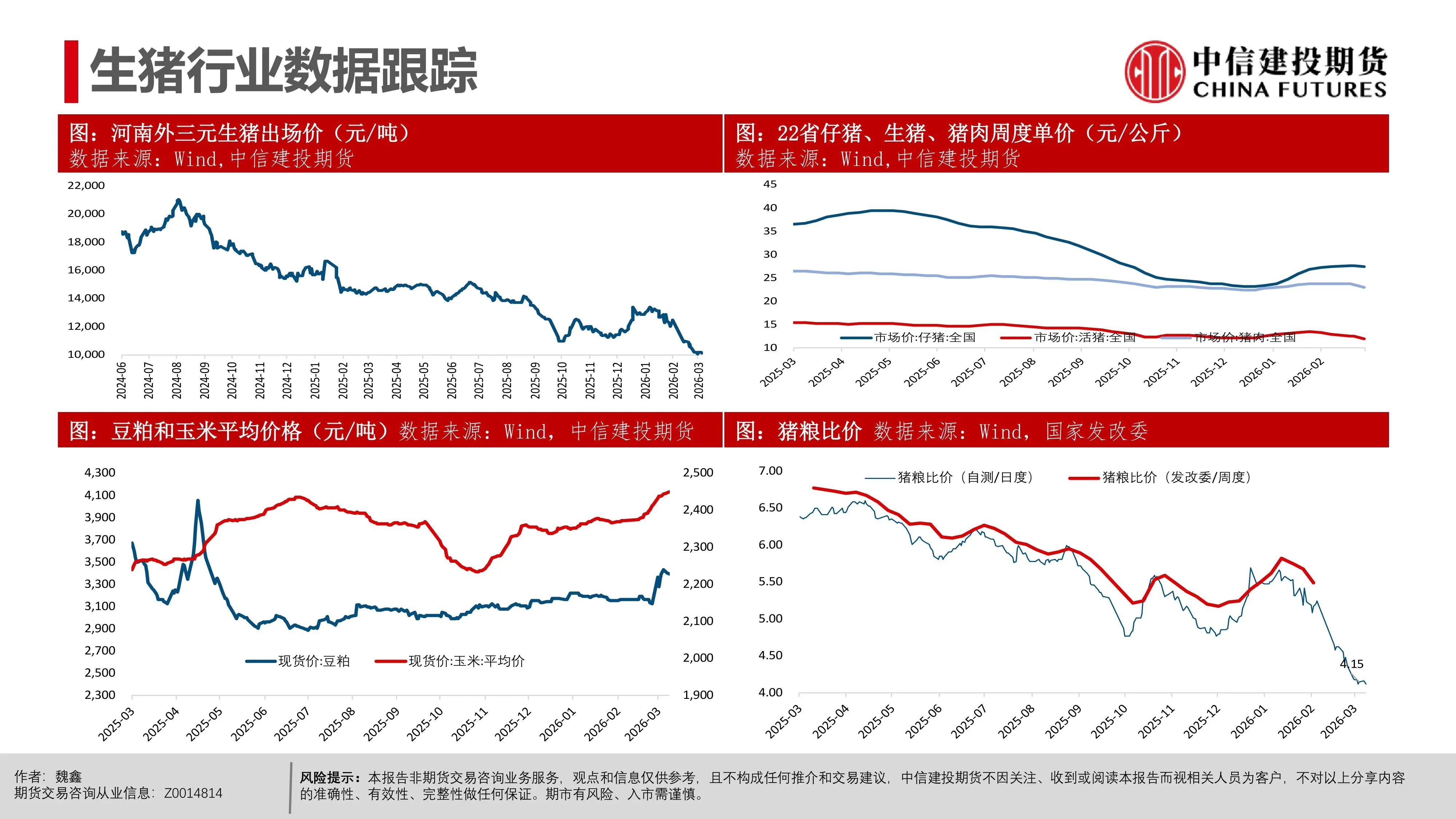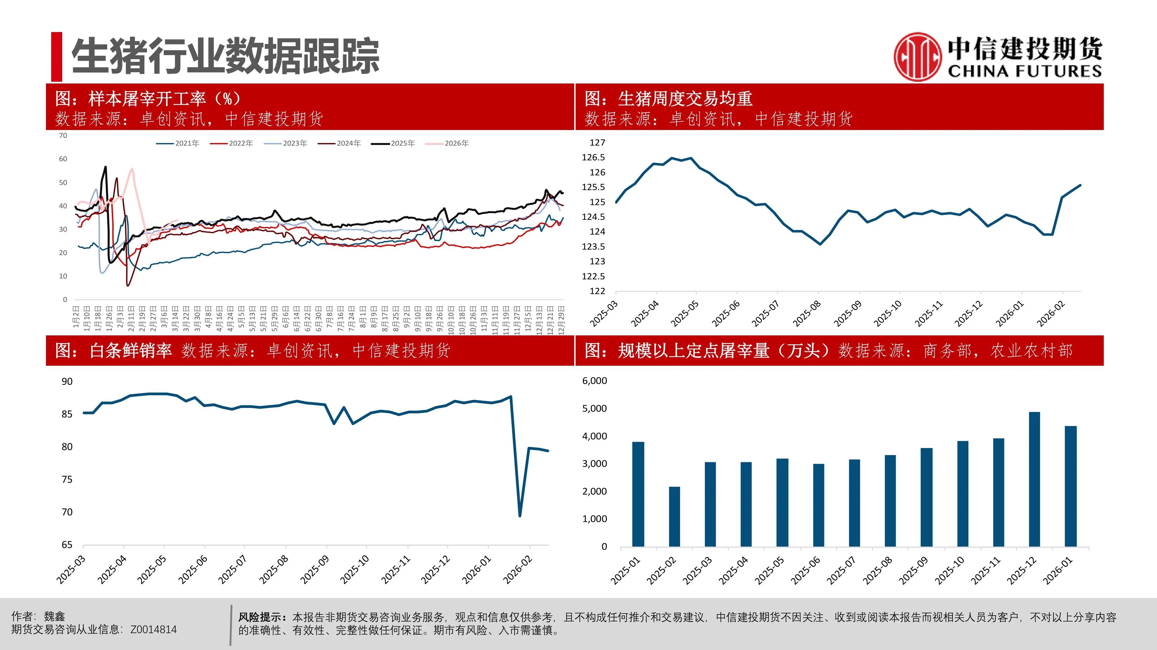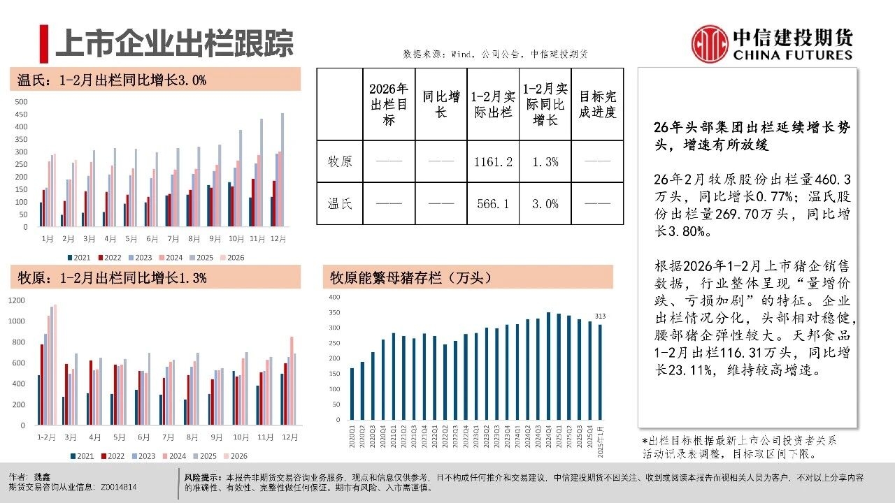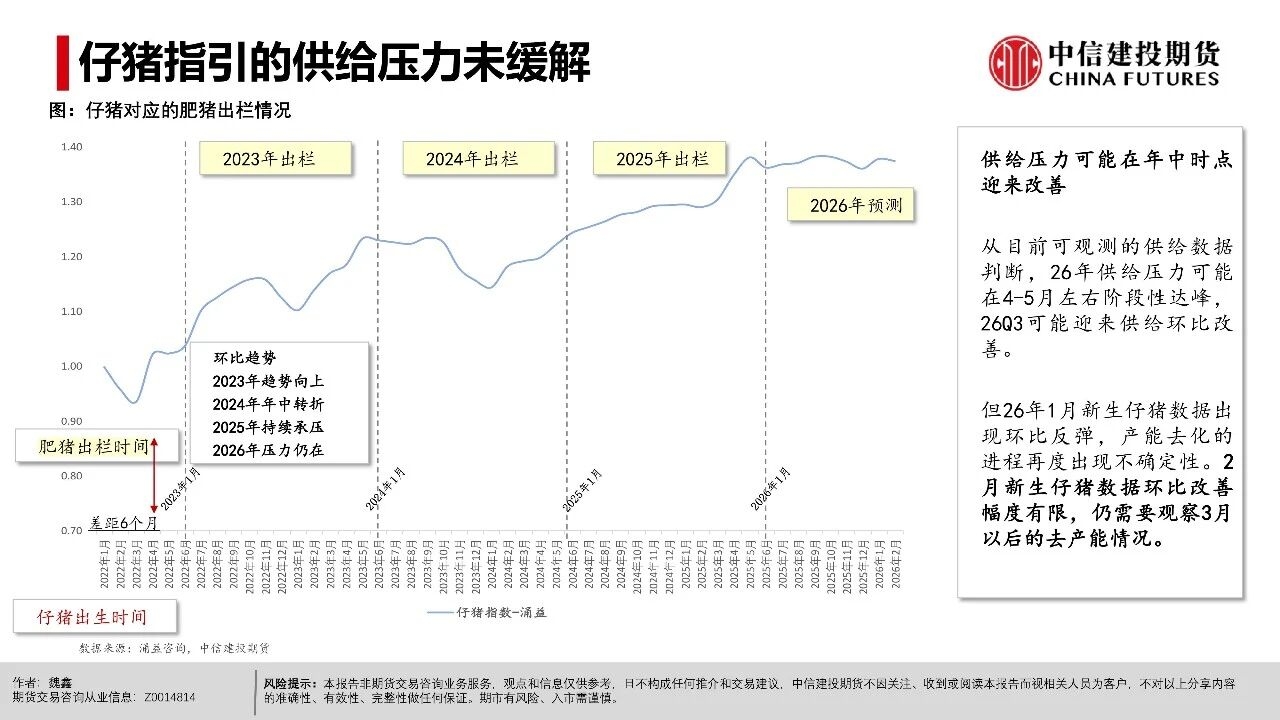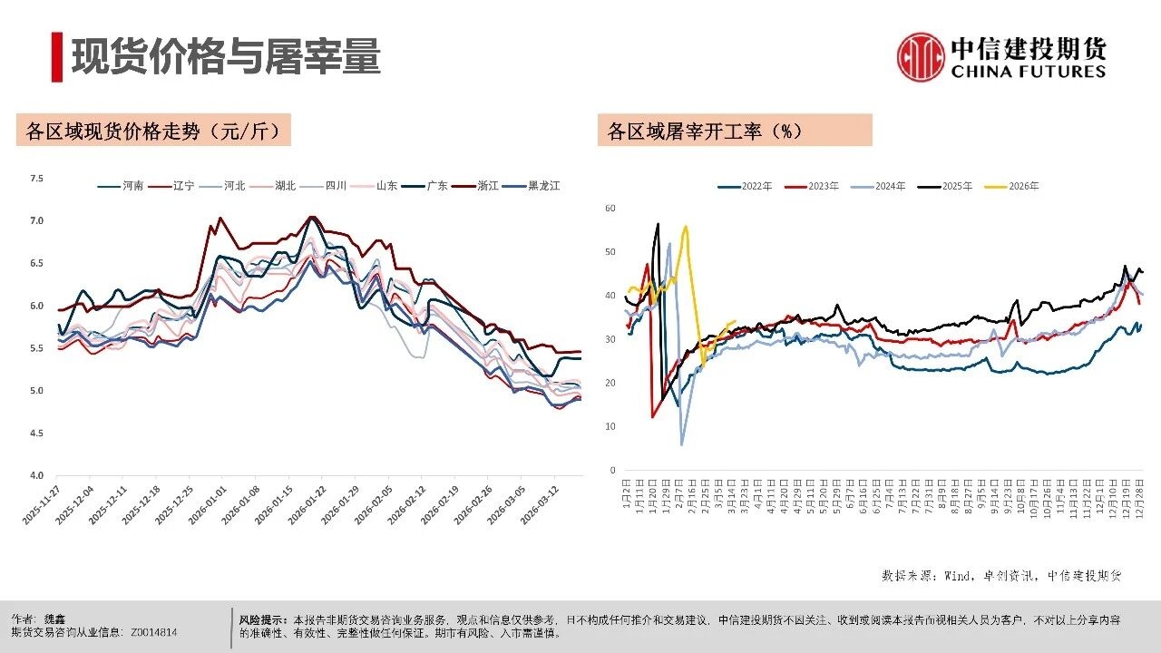 | 近期生猪现货延续磨底探底状态,行业现货价格负反馈延续,相较3月上旬,更多地区跌破10元/公斤,河南地区均价10.06元/公斤,逐步逼近10元/公斤。对近端逻辑而言,值得警惕的是出栏交易均重继续上行,本周交易均重124.6公斤,较近10年交易均重均值多出5公斤。 偏高体重反映当前在现货持续的压力下,产业进入被动累库压栏阶段。但压栏和累库的动作并未带来现货价格的提振,养殖端存栏压力并未得到有效出清,却面临价格降以及库存升的被动局面,或暗示行业负反馈可能延续。 交易思路上,近月与远月逻辑出现明显分化。近月合约2605本周持续下跌,前期相对现货的升水出现收敛。我们认为,在现货持续的负反馈压力下,近月可能产生较强的产业套保对冲需求,导致近月盘面升水难以持续。从需求承接看,冻品、二育延续较为温和的补库节奏。 时间上,考虑到3-6月标肥价差持续收窄的季节性表现,可能进一步限制二育进场的意愿。在产业整体心态比较谨慎的背景下,可能要看到现货出现相对积极的表现后,承接力量才可能集中入场。 中期逻辑上,现货价格创多年新低,行业进入深度亏损阶段。我们认为,远月合约侧重产能去化加速与政策效果预期,尽量关注悲观预期充分兑现后的多配机会,3月可能是年内多重利空因素叠加的时间窗口,待格局改善后,远月行情仍有期待的空间。市场可能在弱势现货表现下逐步打开产能去化空间,给出远月更多向上的空间。 操作策略:(1)养殖套保盘谨慎应对远月行情,考虑预留更多安全边际。26Q3供给曲线指引偏积极,交易题材方面可进一步关注能繁母猪去化情况,远月合约2611、2701持续关注升水收敛后低位多配机会,但也需注意产能去化不及预期风险。