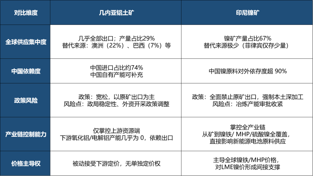 | 要点速览版 供应替代 几内亚短期被替代性较低,但全球可替代供应国较多,难以形成绝对垄断。 全球替代能力 铝土矿增量:短期可释放约4000万吨,澳大利亚为主,巴西、越南、马来西亚、印度为辅; 共性问题:替代国矿石多为中低品位,会显著抬升冶炼成本,实际供应落地存不确定性。 风险点 若配额政策落地力度超预期,市场矛盾将转向矿端供应的实际约束程度。 几内亚政府正酝酿铝土矿产量及出口量约束政策,核心旨在提振铝土矿市场价格、增加政府税收,同时推动本土下游铝工业发展。目前政策具体实施细则尚未明确,最终方案仍待官方正式发布。某种程度上,出口配额或是受产量持续攀升影响,铝土矿FOB价格不断走低,政府税收随之显著缩水,这也进一步坚定了其出台配额政策的决心。 提及配额,镍作为上市有色金属品种,曾多次落地配额相关政策,下文将几内亚铝土矿与印尼镍矿从多核心维度展开对比分析。 几内亚与印尼对比