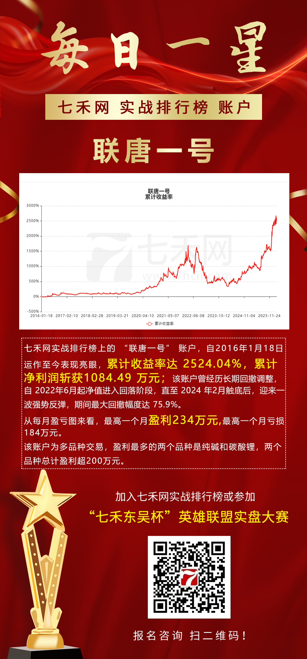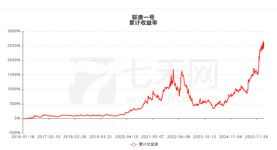 七禾网实战排行榜上的 “联唐一号” 账户,自 2016 年 1 月 18 日运作至今表现亮眼,累计收益率达 2524.04%,累计净利润斩获 1084.49 万元;该账户曾经历长期回撤调整,自 2022 年 6 月起净值进入回落阶段,直至 2024 年 2 月触底后,迎来一波强势反弹,期间最大回撤幅度达 75.9%。