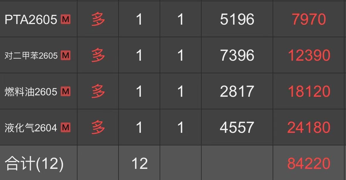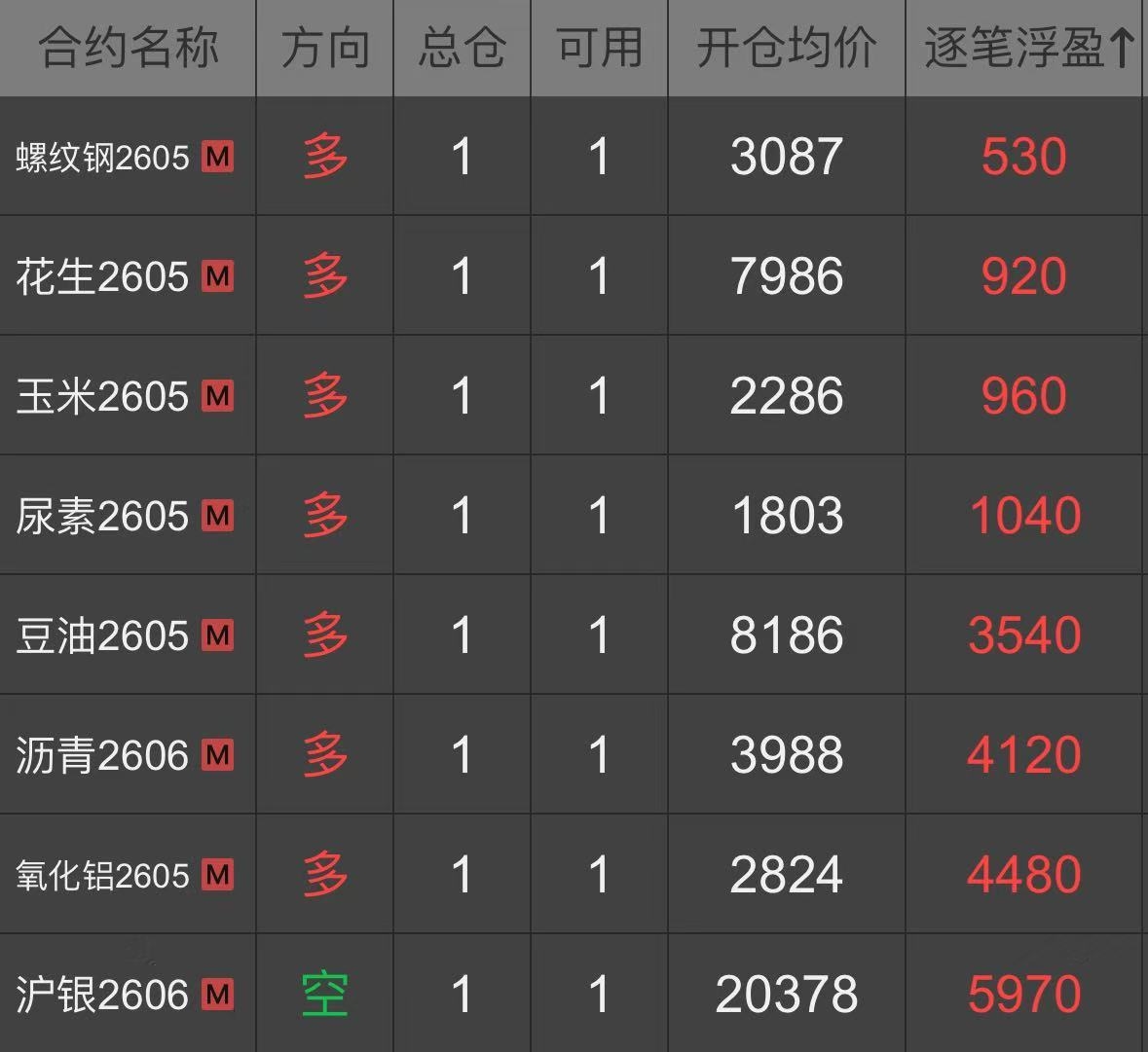 | 一、开仓总结 燃料油:2026年1月9日,达到启动点的开仓条件,所以在14:56开多一手燃料油2603合约,开仓价为2514。燃料油2603合约于2026年2月5日21:35移仓至主力合约2605,开仓价为2817。 PTA:2026年2月10日,达到启动点的开仓条件,所以在14:53开多一手PTA2605合约,开仓价为5230。 玉米:2026年2月10日,达到启动点的开仓条件,所以在14:53开多一手玉米2605合约,开仓价为2286。 尿素:2026年2月11日,达到启动点的开仓条件,所以在14:42开多一手尿素2605合约,开仓价为1803。 沥青:2026年2月25日,达到启动点的开仓条件,所以在14:50开多一手沥青2604合约,开仓价为3359。沥青2604合约于2026年3月12日14:41移仓至主力合约2606,开仓价为3988。 豆油:2026年2月26日,达到启动点的开仓条件,所以在14:45开多一手豆油2605合约,开仓价为8186。 液化气:2026年2月26日,达到启动点的开仓条件,所以在14:45开多一手液化气2604合约,开仓价为4557。 对二甲苯:2026年2月27日,达到启动点的开仓条件,所以在14:53开多一手对二甲苯2605合约,开仓价为7396。 氧化铝:2026年3月6日,达到启动点的开仓条件,所以在14:46开多一手氧化铝2605合约,开仓价为2824。 螺纹钢:2026年3月6日,达到启动点的开仓条件,所以在14:47开多一手螺纹钢2605合约,开仓价为3087。 玻璃:2026年3月10日,达到启动点的开仓条件,所以在14:57开多一手玻璃2605合约,开仓价为1077。 花生:2026年3月10日,达到启动点的开仓条件,所以在14:59开多一手花生2605合约,开仓价为7986。 沪银:2026年3月17日,达到启动点的开仓条件,所以在14:56开空一手沪银2606合约,开仓价为20378。 二、平仓计划 燃料油:达到启动点的平仓止损/止盈条件,在收盘前或下一个交易日开盘后全部平仓。 PTA:达到启动点的平仓止损/止盈条件,在收盘前或下一个交易日开盘后全部平仓。 玉米:达到启动点的平仓止损/止盈条件,在收盘前或下一个交易日开盘后全部平仓。 尿素:达到启动点的平仓止损/止盈条件,在收盘前或下一个交易日开盘后全部平仓。 沥青:达到启动点的平仓止损/止盈条件,在收盘前或下一个交易日开盘后全部平仓。 豆油:达到启动点的平仓止损/止盈条件,在收盘前或下一个交易日开盘后全部平仓。 液化气:达到启动点的平仓止损/止盈条件,在收盘前或下一个交易日开盘后全部平仓。 对二甲苯:达到启动点的平仓止损/止盈条件,在收盘前或下一个交易日开盘后全部平仓。 氧化铝:达到启动点的平仓止损/止盈条件,在收盘前或下一个交易日开盘后全部平仓。 螺纹钢:达到启动点的平仓止损/止盈条件,在收盘前或下一个交易日开盘后全部平仓。 玻璃:达到启动点的平仓止损/止盈条件,已于2026年3月18日14:47平仓,平仓价为1069,平仓亏损160元。