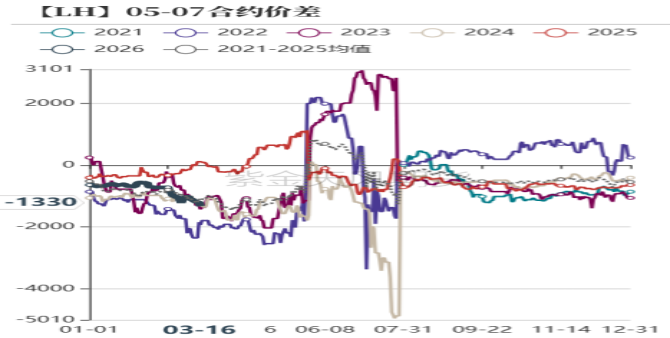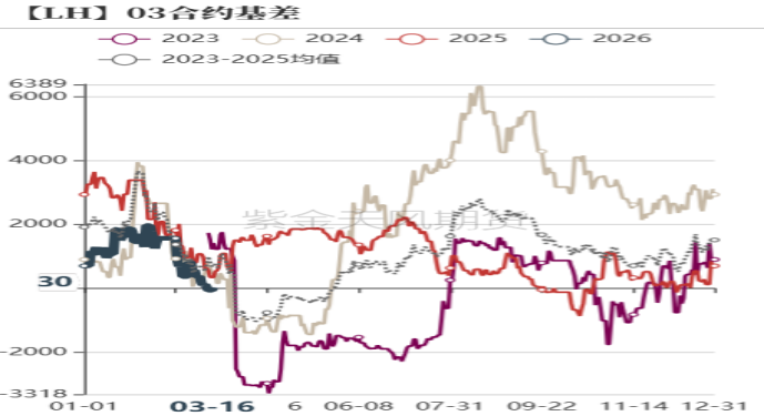 数据来源: 紫金天风期货研究所 4、近月合约基差持续回落 即将进入交割月的LH2603合约呈现平水状态,市场对3月猪价整体较为悲观。因去产能预期,加上需求在3月之后呈现逐步复苏的趋势,LH2605合约呈现小幅升水,相对合理。LH2605与LH2607价差接近往年均值水平,正常情况下价差高于1500后,或有二育套利进场,若价差大于2000,套利风险较小,因此关注价差过大或过小时带来的套利机会。 近日生猪期货合约持仓量持续增加,总合约持仓数量接近40万手,较3月初增加约30%,可以看出市场多空博弈急剧,抄底情绪以及套保意愿都较为强烈,短期在情绪化过后,或许将跟随底部区间震荡。 图7:2603及2605合约基差