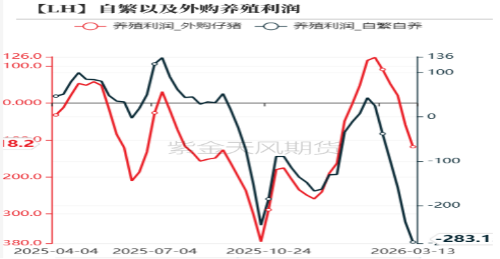 数据来源: 紫金天风期货研究所 3、养殖成本下降,但养殖利润亏损幅度扩大 截止到2026年3月13日自繁自养亏损283元/头;外购仔猪养殖亏损118元/头,2月以来生猪价格持续走低,外购仔猪以及自繁自养模式的养殖利润亏损幅度持续扩大,这个养殖利润计算方式是整个行业的,若按上市及集团企业公告的养殖成本计算,其养殖亏损幅度要低于行业平均成本。 从上市企业公告来看,目前一些优秀企业将养殖成本已经控制在12元/公斤左右,这也是市场相对认可的底价,可看做市场的心理价位。今年猪企成本降幅较大,主要受三大因素影响。第一,饲料原料价格下降以及饲料成本控制能力提升。第二,生产流程优化,产能利用率提高;第三,养殖水平提高,料肉比、日增重、成活率等生产成绩指标向好。 图5:自繁自养以及外购仔猪养殖利润