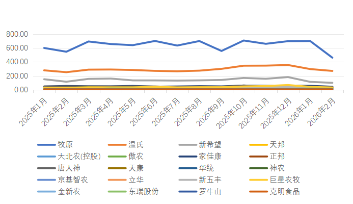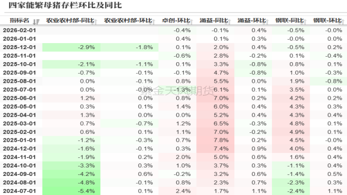 数据来源:紫金天风期货研究所 2、集团企业扩张,去产能难度较大 统计局五部联合发布,截止到2025年年底,能繁母猪存栏3961万头,较9月底下跌74万头,下降1.8%,为正常保有量(3900万头)的101.6%;钢联数据显示2月能繁母猪存栏量为环比增加0.0%,同比下跌0.0%,涌益数据显示2月能繁母猪存栏量环比增加0.4%,同比下降0.1%。钢联样本企业调查数据显示,2025年2月仔猪出生量578万头,环比增加0.76%;2月仔猪销量46万头,环比减少9.5%。 从去年5月起,农业农村部就提出控体重、去产能,因去产能效果不佳,政府继续积极约谈以及呼吁,但仍然效果不佳。从能繁母猪数据来看,2025年年底能繁母猪数据仅比2025年6月能繁母猪存栏下降2%,但若加上持续优化的生产性能,实际落到生猪产能方面,或并未有环比下降趋势,从近期商品猪存栏情况下来看,反而是小幅增加的趋势。从养殖端利润的角度看,自去年9月以来,生猪行业已经进入亏损阶段,春节虽有短暂回暖,但幅度有限。在政府约谈以及倡导去产能,加上长时间亏损,并未造成实质性改善,其实核心问题还是集团企业以及上市企业去产能意愿较差。 2025年20家上市公司商品猪出栏1.8亿头,较2024年商品猪出栏增加20%,而2024年本身产能已经供需宽松,2025年上市企业商品猪产能再度大幅增加,可以看出上市企业并未因可预见性商品猪产能过剩,而停止扩展,也并不着眼于短期企业盈亏(毕竟凑集资金来源较为充裕,特别是从资本市场),更多是为了从长期战略角度抢占市场份额,因此在现阶段现货价格持续下跌,企业又想在熊市中生存下来,只能通过降本增效来缓解现金流压力以及资本压力,即使在饲料价格持续上涨的情况下,养殖成本仍在持续下降,或许是明面上的,或许是真能做到,这里面的原因大家也都懂得。整体来看在现阶段没有疫情情况下,产能的去化或者局势扭转,需要中小企业持续退出以及资金流越发紧张的企业被迫加快商品猪抛售并回流资金,这也是近期即使商品猪已经跌至10元/公斤,但养殖端仍在积极出栏,主动以及被动的出栏导致短期市场严重过剩。 生猪行业发展到这个阶段,也已经脱离了原有猪周期以及猪瘟前的行业以及价格规律,在集团企业话语权更重的情况下,中小企业求生困难性的确很大,因此只能被迫退出市场,或者转型。在这里建议上市企业以及集团企业停止扩张规模,从增加猪肉附加值以及产业链深度方面,给企业赋能,使行业回到供需相对平衡的状态下运行。 图2:农业农村部以及其他三家母猪存栏环比以及同比