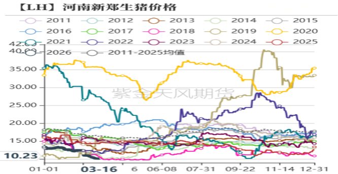 | 1、现货价格持续回落 自2025年7月以来,商品猪现货价格进入漫漫寻底路,去年10月河南商品猪均价跌破11元/公斤关口,四季度虽有春节需求旺季,价格短暂回暖,但春节后再度大幅下跌,创下非洲猪瘟以来新低,截止到3月17日,河南地区生猪现货价格跌至10.2元/公斤,养殖端单位亏损幅度达到20%。 图1:河南地区生猪均价