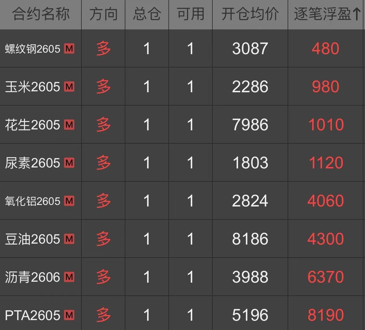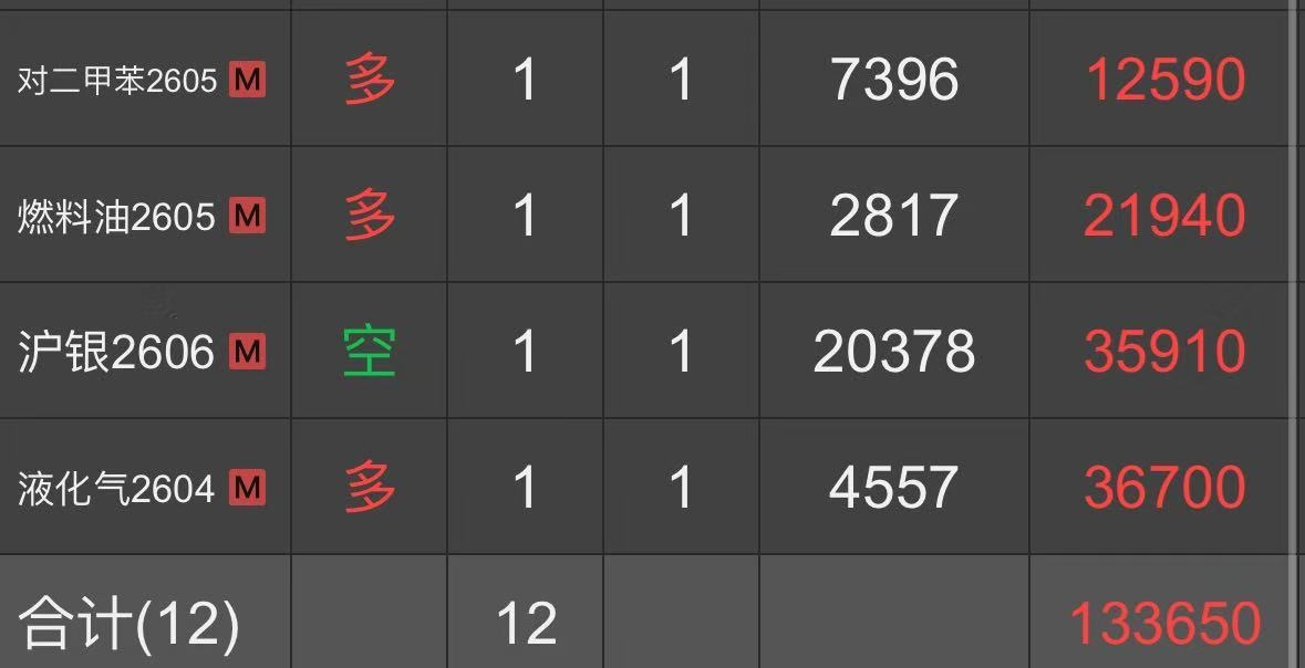 | 一、开仓总结 燃料油:2026年1月9日,达到启动点的开仓条件,所以在14:56开多一手燃料油2603合约,开仓价为2514。燃料油2603合约于2026年2月5日21:35移仓至主力合约2605,开仓价为2817。 PTA:2026年2月10日,达到启动点的开仓条件,所以在14:53开多一手PTA2605合约,开仓价为5230。 玉米:2026年2月10日,达到启动点的开仓条件,所以在14:53开多一手玉米2605合约,开仓价为2286。 尿素:2026年2月11日,达到启动点的开仓条件,所以在14:42开多一手尿素2605合约,开仓价为1803。 沥青:2026年2月25日,达到启动点的开仓条件,所以在14:50开多一手沥青2604合约,开仓价为3359。沥青2604合约于2026年3月12日14:41移仓至主力合约2606,开仓价为3988。 豆油:2026年2月26日,达到启动点的开仓条件,所以在14:45开多一手豆油2605合约,开仓价为8186。 液化气:2026年2月26日,达到启动点的开仓条件,所以在14:45开多一手液化气2604合约,开仓价为4557。 对二甲苯:2026年2月27日,达到启动点的开仓条件,所以在14:53开多一手对二甲苯2605合约,开仓价为7396。 氧化铝:2026年3月6日,达到启动点的开仓条件,所以在14:46开多一手氧化铝2605合约,开仓价为2824。 螺纹钢:2026年3月6日,达到启动点的开仓条件,所以在14:47开多一手螺纹钢2605合约,开仓价为3087。 花生:2026年3月10日,达到启动点的开仓条件,所以在14:59开多一手花生2605合约,开仓价为7986。 沪银:2026年3月17日,达到启动点的开仓条件,所以在14:56开空一手沪银2606合约,开仓价为20378。 二、平仓计划 燃料油:达到启动点的平仓止损/止盈条件,在收盘前或下一个交易日开盘后全部平仓。 PTA:达到启动点的平仓止损/止盈条件,在收盘前或下一个交易日开盘后全部平仓。 玉米:达到启动点的平仓止损/止盈条件,在收盘前或下一个交易日开盘后全部平仓。 尿素:达到启动点的平仓止损/止盈条件,在收盘前或下一个交易日开盘后全部平仓。 沥青:达到启动点的平仓止损/止盈条件,在收盘前或下一个交易日开盘后全部平仓。 豆油:达到启动点的平仓止损/止盈条件,在收盘前或下一个交易日开盘后全部平仓。 液化气:达到启动点的平仓止损/止盈条件,在收盘前或下一个交易日开盘后全部平仓。 对二甲苯:达到启动点的平仓止损/止盈条件,在收盘前或下一个交易日开盘后全部平仓。 氧化铝:达到启动点的平仓止损/止盈条件,在收盘前或下一个交易日开盘后全部平仓。 螺纹钢:达到启动点的平仓止损/止盈条件,在收盘前或下一个交易日开盘后全部平仓。 花生:达到启动点的平仓止损/止盈条件,在收盘前或下一个交易日开盘后全部平仓。 沪银:达到启动点的平仓止损/止盈条件,在收盘前或下一个交易日开盘后全部平仓。 注:本交易总结由第三方提供,只作为投资理念和方法的交流,不作为七禾网的观点,也不作为投资参考和建议。 附: 1、交易者简介 十年股票/期货/外盘交易经验,每年都实现投资盈利。 擅长微观盘面分析和宏观市场分析,总结了数套有效的盈利模式,和众多高手有深入交流,收益良好。 2、持仓截图