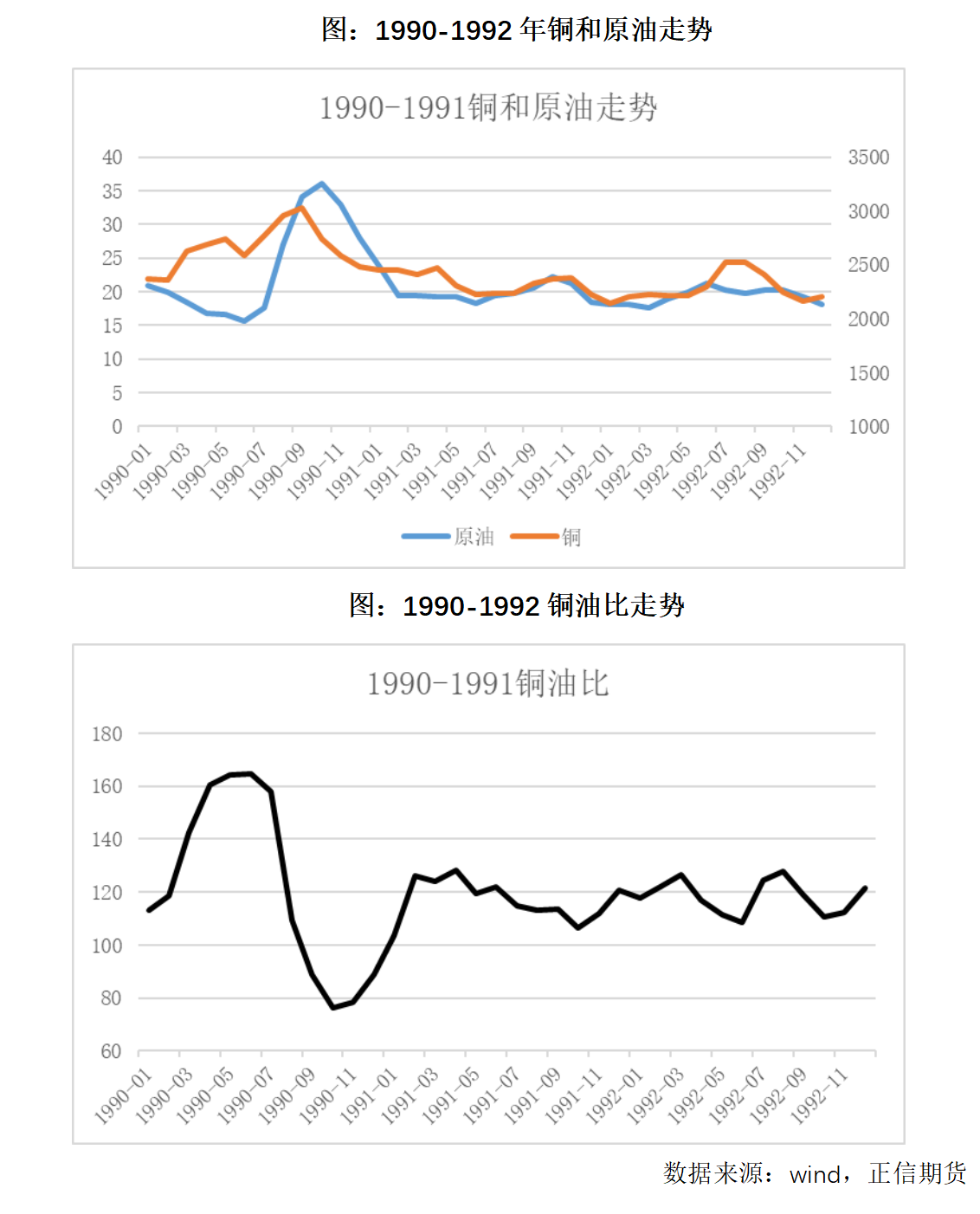 3、1990-1991海湾战争 1990年伊拉克入侵致两国石油产能完全中断(430万桶/日),油价从17美元/桶短时冲至41美元/桶,不过因战争迅速结束,价格也快速回落,因此这一情形没有导致油价长期中枢的抬升。铜与原油协同波动,美国通胀自身没有大的问题,短时冲高至6%后一直回落至3%以下。铜油比基本围绕120桶中枢位波动, 铜价相对强于油价。