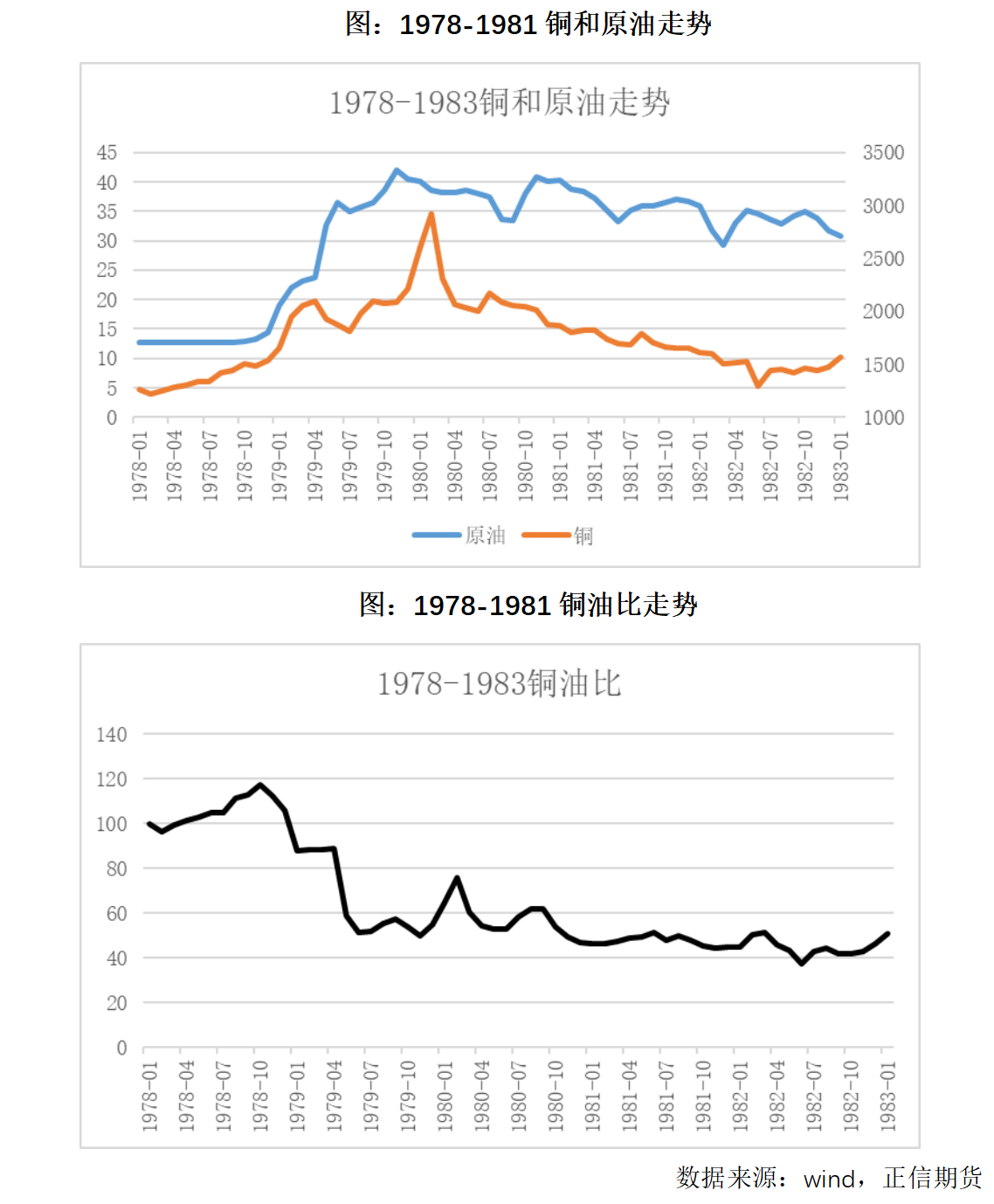 2、1978-1981年间伊朗伊斯兰革命与两伊战争 1978-1981出现两次中东局势扰动供给端的时间,一个是1978-1980伊朗政权更迭,伊斯兰革命导致石油出口完全中断,引发全球供应恐慌,;二个事1980-1981爆发的两伊战争,两个主要产油国的石油设施互相摧毁,全球产量骤降。第一个阶段油价从14美元/桶涨至39-41美元/桶,第二个阶段从32美元/桶涨至40美元/桶-6;高点曾达42美元。由于这两场冲突时间接近,供给冲击连续,且油价也最终演变成长期高位,和第四次中东战争类似,从经济增长>通货膨胀变为经济增长<通货膨胀,铜价出现明显下跌。期间美联储为了遏制14%的通货膨胀率开启快速加息模式,加速了经济周期的演变。
