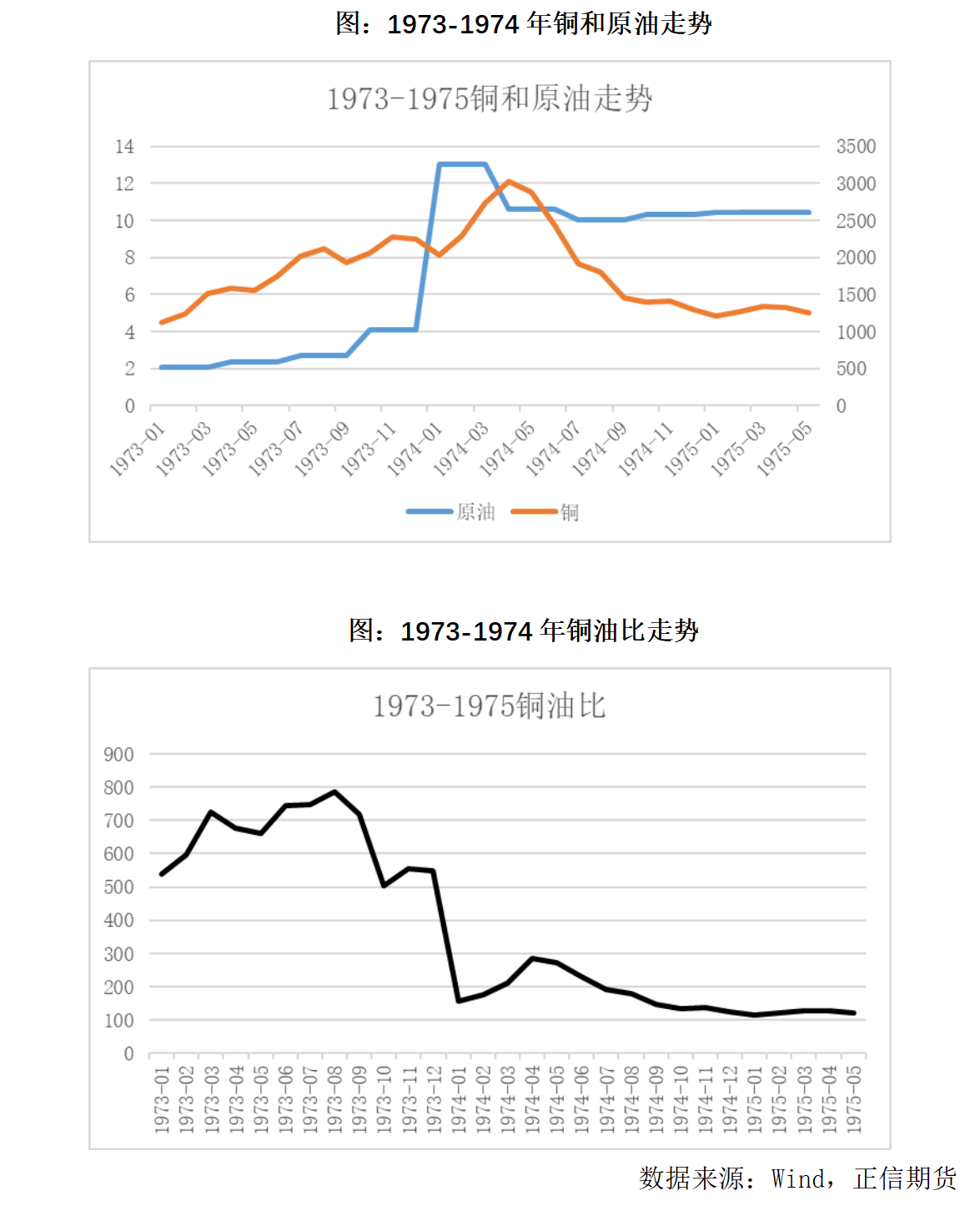 二、供给端冲击油价形成短期利空,还需关注油价长期中枢变化的影响 回顾过去由于供给端,尤其是地缘冲突对油价的影响,以及铜油比对应的表现,我们挑选两次油价长期中枢抬升,和两次油价瞬时波动的情形,在长期中枢抬升的背景下,铜价压力较大,经济周期容易从从经济增长>通货膨胀变为经济增长<通货膨胀由此带来需求压力。在瞬时波动的情形下,短期铜价会因为担忧滞胀环境的形成而短期下跌,但随后铜油比出现缓慢回升,并让铜价表现强于油价。两种情形对应的经济周期与需求预期节奏不同,但核心需要持续关注美国通货膨胀率的变化,短期铜价的压力难以释放。 1、1973-1974年第四次中东战争 阿拉伯产油国对支持以色列的西方国家实施石油禁运,首次将石油作为政治武器,原油从3美元/桶涨至12美元/桶,上涨约300%。而当时经济环境正值上行期,铜价呈现明显的上涨态势,美国通胀从温和的3.6%开始回升,但当油价快速拉升,且长期维持高位后,美国通胀水平一度涨至12%,从经济增长>通货膨胀变为经济增长<通货膨胀,铜价出现明显下跌,铜油比先涨后跌,油价的长期高位给经济增长带来了不小的冲击,铜价因此表现出较大的跌幅。