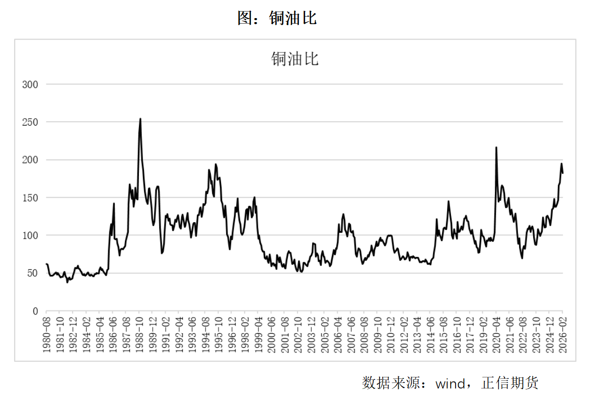 三、总结 通过回顾过去铜油比的极端变化,不难发现铜油比的大幅波动更多与经济周期的切换息息相关,在去年年底黄金与有色加速演绎后,铜油比提高到了历史高位,而短时伊朗战争风险,将铜油比拉回中枢上沿。后续的演变,仍将围绕地缘代表的油价长期中枢博弈与宏观代表的美国通胀之间进行,如果是瞬时波动,那么后续将会走出铜升油降,铜油比上升的节奏,还是在原经济周期上波动;如果地缘风险持续,油价长期中枢抬升,铜油比则还有下降空间,经济周期也面临切换的风险;不论哪一种情形,短时油价对铜价的影响更偏负面,由于地缘博弈与美国当前政府本身的诉求还有诸多矛盾,理论假设情形小油价仍然不会长期维持高位,那么当前乃至3-4月则给到国内下游较好的点价时机。 责任编辑:七禾编辑 |