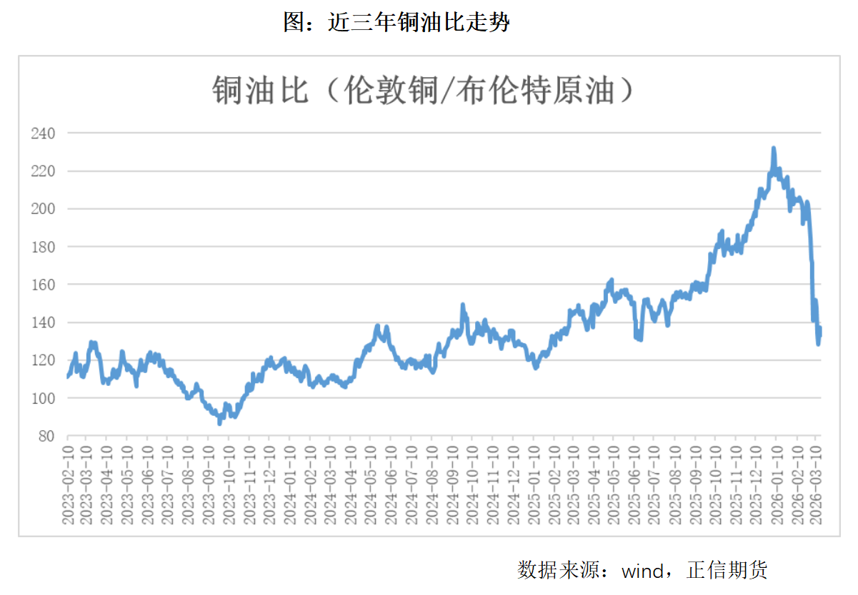 | 三月地缘局势搅动大宗商品市场,美以与伊朗的冲突,霍尔木兹海峡的封锁,将大宗商品波动率再次推向新的高度,原油作为传统大宗之王再度回归,牵动一众化工品价格快速飙升,在地缘局势下,前期累积较高涨幅的黄金和铜却逐渐表现出价格压力,甚至跌出高位区间,铜油比这个过去描述经济周期的指标,从2026年1月一吨铜可以换220桶原油的历史高位,大幅下滑至目前一吨铜仅能换130桶原油,铜油比暴跌背后尽管是油价的大幅拉涨引动,但由于滞胀风险突出,前期推升铜价的主要驱动弱化,铜价则在这轮地缘冲突中扮演需求预期受阻的偏空角色。 当前油价中枢被明显抬高,铜油比回归均值区间,即80-120桶附近,这个比率波动剧烈,从历史高位的快速回落,除了商品市场内部的板块轮动,贵金属-有色-化工,实则代表了经济增长与通货膨胀之间力量平衡的打破与重塑。