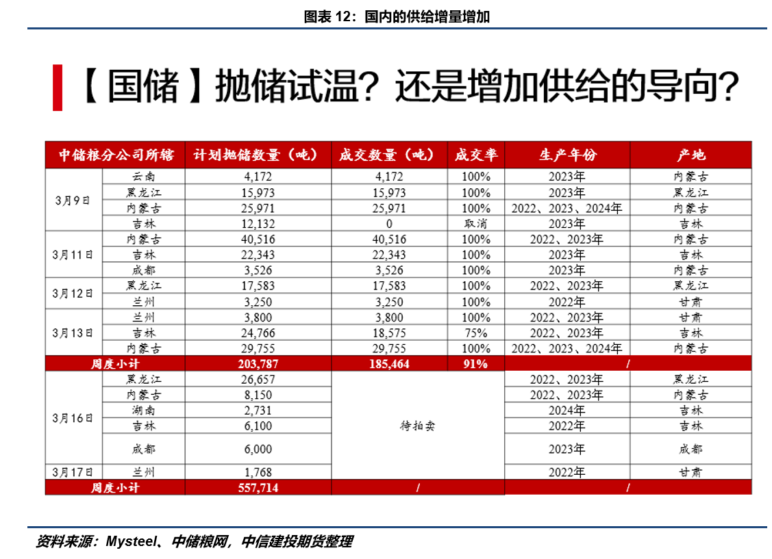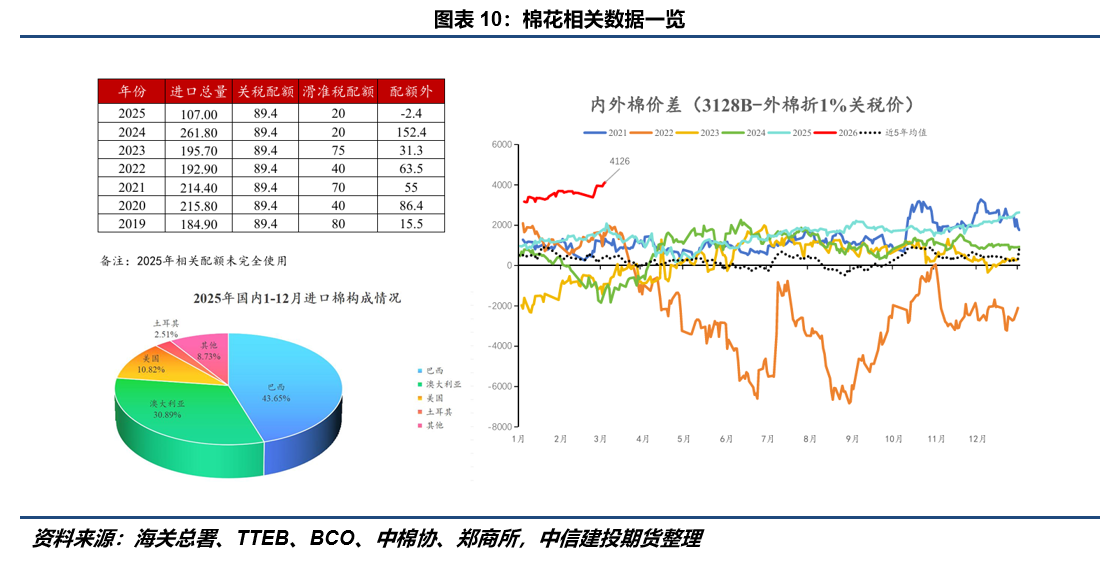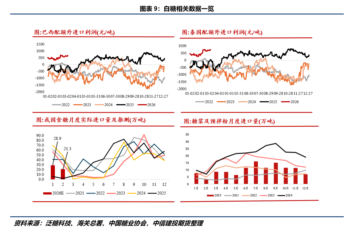 具体来看,在过往几年里,以棉花、白糖等为代表的配额管理商品进口已出现实质性收缩。数据显示,2025年国内棉花进口总量预计仅为107万吨,较2024年的261.8万吨骤降近60%,且当年89.4万吨的关税配额并未完全使用;2026年食糖月度进口量将较前几年大幅收缩,2-3月预测值仅在20-30万吨水平。同时,作为替代品的糖浆及预拌粉进口量维持低位,未出现显著增长;谷物进口亦呈现趋势性回落,自2024年下半年起,玉米、小麦、高粱及大麦的月度进口量均从高位显著下滑,至2025年已普遍降至近年低位。这也相当程度的作为国内定价显著高于海外定价的原因,不断走阔的内外价差也成为市场的重要矛盾。 某种意义上,进口利润为国内价格构筑了明确的“估值天花板”。 无论是棉花的滑准税配额成本,还是食糖、谷物的配额外进口利润,都成为国内价格交易情绪溢价的某种平衡力量。目前国内诸多农产品已经迈过了农户售粮压力最大的时期,国内储备整体也相抵充裕,因此在历史价差的背景下,需要警惕进口政策边际放松和国内储备农产品阶段性轮出的可能性,这将可能出现空头交易的回归。