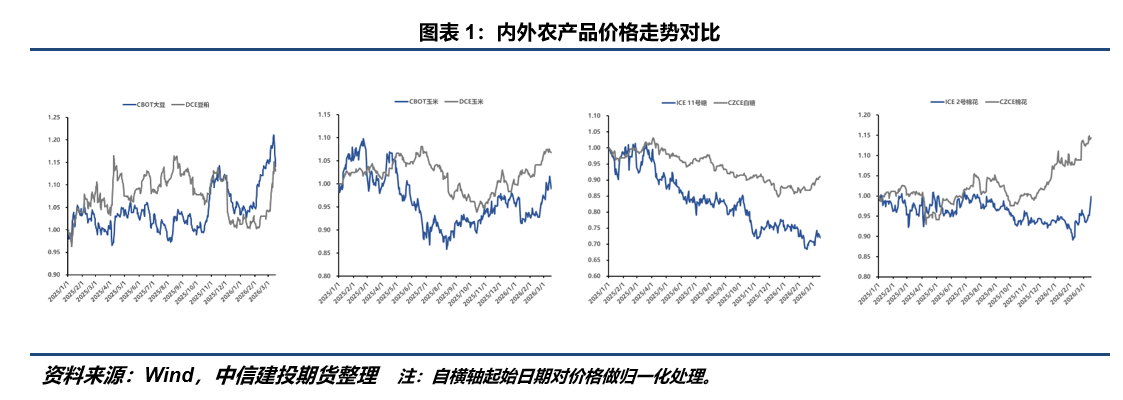 | 本文重点拟从商品整体变动对于农产品定价扰动的框架、现实跟踪和动态的政策预期这几个方面进一步拆解农产品的未来波动趋势。 在强劲的宏观周期与地缘政治叙事驱动下,传统基于单品种供需平衡表的基本面定价逻辑被阶段性“扬弃”。这意味着,原油上涨并非作为一个孤立事件影响市场,而是作为一轮强大的宏观与通胀周期的火车头,其影响通过多重渠道系统性重塑了农产品的估值体系。 从问题意识的角度来看,当下的农产品市场有以下几大关键分歧: A - 过去糖、棉花、玉米以及大豆的进口政策收紧之后,已经令国内粮价保持坚挺,而最近国内基于流动性而再次助力的走高让诸多品种的内外价差达到了历史峰值水平。农业政策是根植于安全、效率、成本等诸多考虑的最优解,但因为动态的条件变化,“进口政策”的稳定性已经出现了边际性的松动,我们对于情绪定价而形成的高位天然迟疑和警惕。最近几日已然出现的棉花增发滑准税配额成为可能的信号灯?