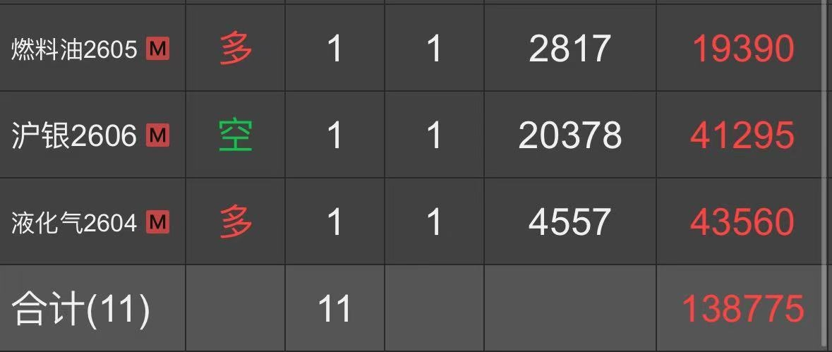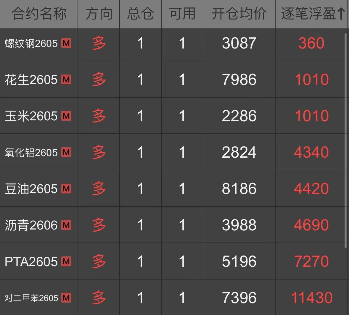 | 一、开仓总结 燃料油:2026年1月9日,达到启动点的开仓条件,所以在14:56开多一手燃料油2603合约,开仓价为2514。燃料油2603合约于2026年2月5日21:35移仓至主力合约2605,开仓价为2817。 PTA:2026年2月10日,达到启动点的开仓条件,所以在14:53开多一手PTA2605合约,开仓价为5230。 玉米:2026年2月10日,达到启动点的开仓条件,所以在14:53开多一手玉米2605合约,开仓价为2286。 尿素:2026年2月11日,达到启动点的开仓条件,所以在14:42开多一手尿素2605合约,开仓价为1803。 沥青:2026年2月25日,达到启动点的开仓条件,所以在14:50开多一手沥青2604合约,开仓价为3359。沥青2604合约于2026年3月12日14:41移仓至主力合约2606,开仓价为3988。 豆油:2026年2月26日,达到启动点的开仓条件,所以在14:45开多一手豆油2605合约,开仓价为8186。 液化气:2026年2月26日,达到启动点的开仓条件,所以在14:45开多一手液化气2604合约,开仓价为4557。 对二甲苯:2026年2月27日,达到启动点的开仓条件,所以在14:53开多一手对二甲苯2605合约,开仓价为7396。 氧化铝:2026年3月6日,达到启动点的开仓条件,所以在14:46开多一手氧化铝2605合约,开仓价为2824。 螺纹钢:2026年3月6日,达到启动点的开仓条件,所以在14:47开多一手螺纹钢2605合约,开仓价为3087。 花生:2026年3月10日,达到启动点的开仓条件,所以在14:59开多一手花生2605合约,开仓价为7986。 沪银:2026年3月17日,达到启动点的开仓条件,所以在14:56开空一手沪银2606合约,开仓价为20378。 二、平仓计划 燃料油:达到启动点的平仓止损/止盈条件,在收盘前或下一个交易日开盘后全部平仓。 PTA:达到启动点的平仓止损/止盈条件,在收盘前或下一个交易日开盘后全部平仓。 玉米:达到启动点的平仓止损/止盈条件,在收盘前或下一个交易日开盘后全部平仓。 尿素:达到启动点的平仓止损/止盈条件,已于2026年3月20日14:55平仓,平仓价为1838,平仓盈利700元。
