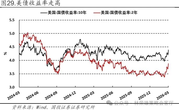 美国3个月国债收益率报收3.74%,前值3.72%;10年期国债收益率报收4.39%,上周前值4.28%。本周美债收益率上行的消息面原因如下:一、美国五角大楼向中东增派三艘军舰并增派约2500名海军陆战队员,伊朗则宣布“完全关闭”霍尔木兹海峡作为回应;二、美联储3月FOMC会议释放强烈鹰派信号,投票结果为11:1仅理事米兰主张降息,点阵图显示2026年核心PCE通胀预测从2.5%大幅上调至2.7%,鲍威尔明确表示“如果没有看到通胀方面的进展就不会降息”并透露委员会确实讨论过“下一步是否加息”,导致市场对降息预期进行剧烈修正,CME显示年内降息的概率从38.6%暴跌至12.8%。 从传导机制来看,本轮美债收益率的走势打破了传统的地缘冲突交易模式:以往中东局势紧张时,资金通常会涌入美债避险推动收益率下行,但这一次由于冲突发生在全球核心产油区,市场优先交易的是“油价冲击→通胀预期升温→美联储鹰派→收益率上行”的逻辑链条。此外,美国国债总额突破39万亿美元、五角大楼要求追加2000亿美元军费等消息也加剧了市场对财政赤字扩大的担忧,进一步压制了长债需求。