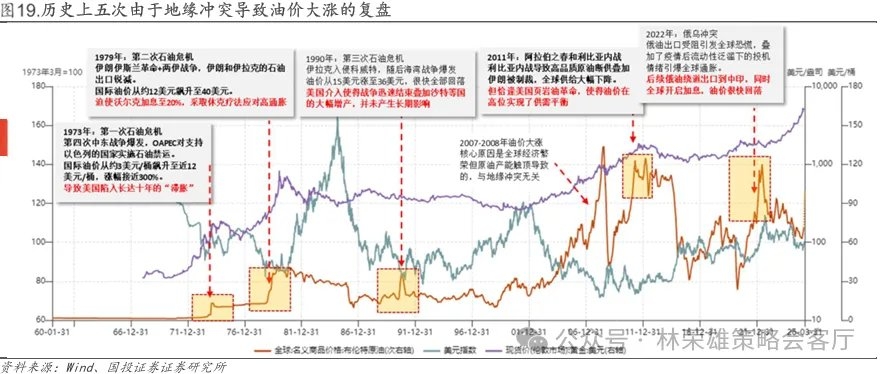 第四,对于当前油价持续上涨可能的潜在影响,我们复盘了1970年代至今五次由于地缘冲突导致油价大涨的行情,其中与本次行情的异同类比如下: 与当前环境最类似的是1979年的第二次石油危机:1979年伊朗伊斯兰革命爆发,紧接着1980年两伊战争打响。伊朗的政权更迭导致其原油产量从每日600万桶断崖式下跌至不到100万桶。并且两伊战争期间,从1981年出现了 “袭船战”,双方利用反舰导弹攻击进出波斯湾的中立国油轮,企图切断对手的经济命脉,这导致霍尔木兹海峡的运力大幅度下降,全球通胀飙升。这迫使时任美联储主席沃尔克采取了极其激进的加息政策(联邦基金利率一度逼近20%),通过主动制造严重的经济衰退来扼杀通胀。(但要注意,即使是两伊战争时期,霍尔木兹海峡也并非如当前一般“被封锁”)。 对全球经济格局影响最大的是1973年的第一次石油危机,主要催化是第四次中东战争(赎罪日战争)爆发,OAPEC(阿拉伯石油输出国组织)对支持以色列的国家实施石油禁运。国际油价在短短几个月内从约3美元/桶飙升至近12美元/桶,涨幅接近300%。当时西方国家正处于战后经济繁荣的顶峰,对能源的刚需极强。这次危机直接终结了资本主义的“黄金时代”,美国陷入长达十年的“滞胀”。 石油价格短期冲高后很快回落的案例是1990年的海湾战争和2022年的俄乌冲突:前者的快速回落是三个原因:第一,战争没有封锁霍尔木兹海峡;第二,美国迅速军事介入并取得压倒性胜利;第三,沙特等国迅速释放了闲置产能填补缺口。而后者则是因为在出口受阻后,俄罗斯并没有停止产油。同时,为了压制通胀,美联储开启了历史上节奏最快的加息周期,这导致全球需求迅速下滑,最终油价回落到战争前的水平。 油价在短期飙升后长期在高位横盘的案例是2011年的利比亚内战:当时油价大涨实质上是供需两端共振的结果,需求端:2011-2014年期间,中国正处于重化工业与基建投资繁荣的尾声阶段,对大宗商品的刚性吞吐量极高,这为全球原油需求构筑了坚实的底座,同时,美联储在这一时期实施了QE2并延续至后续的宽松政策,将基准利率压制在接近零的水平;供给端:2011年北非与中东爆发“阿拉伯之春”,利比亚陷入内战,导致其日均近150万桶的高品质“轻质低硫原油”产能消失。2012年西方国家因核问题对伊朗实施严厉的经济与原油出口制裁,全球原油供给进一步下降。而油价没有进一步暴涨的原因是2012年开始美国页岩油产能开始大幅度增加,填补了利比亚、伊朗等地缘冲突造成的减产缺口,维持了全球供需的紧平衡。 回到当下的市场,全球原油供应面对的挑战是空前的: 第一,霍尔木兹海峡的封锁导致全球20%的原油产能缺失,并且比1979年更危险的是,因为海峡被持续封锁,中东产油国的储油罐已经迅速灌满。伊拉克的原油产量已经被迫大幅削减了约60%(从日产430万桶骤降至170-180万桶),阿联酋和科威特也开始跟随减产。这意味着,即使战争立刻停止,庞大的原油供应链也需要极长的时间才能重新疏通。 第二,全球不再像2011年或1990年一样具有较大的产能缓冲垫,美国的原油产能已经接近极限高位平台,中东的增产在海峡被封锁的情况下不具备现实意义,目前全球已经进入消耗战略储备的阶段。 第三,长期来看,油价维持高位将对大类资产定价产生深远影响,如果高油价持续至下半年,可能导致美联储在年内放弃降息甚至转向加息,从而进一步推升美元和美债利率,可能带来的影响有两方面:第一,强美元将进一步压制贵金属价格的表现,导致黄金白银继续被抛售。第二,高利率将影响全球财政扩张和AI企业资本开支的能力,可能会逆转2025年以来对于AI CAPEX的乐观叙事,从而导致科技股大幅度的估值下修。