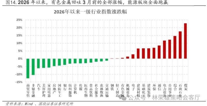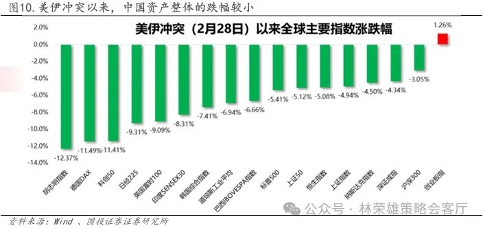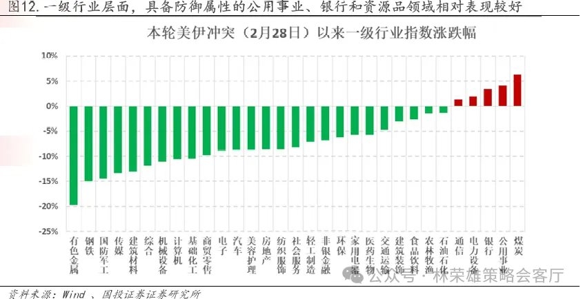 第三,近期美伊冲突有愈演愈烈的趋势,自2月28日冲突爆发以来,霍尔木兹海峡的封锁已经持续了两周以上,尽管全球各国均释放战略储备以维持油价稳定,但在未看到缓和迹象的战场局势影响下,油价依然震荡走高,布油已经站上100美元,全球风险资产也开始加速下跌。随着拉里贾尼被斩首和伊朗天然气田被袭击,伊朗的复仇行动全面升级,打击范围扩散至周边海湾国家的油气基础设施。美国方面则表示要攻占伊朗石油出口枢纽哈尔克岛,且进一步向波斯湾增派了地面部队。市场陷入恐慌的核心原因是市场开始意识到,在短期美以对于霍尔木兹海峡的封锁并无有效应对的手段,且战事已超出美国的控制,高油价下滞胀交易的阴影似乎越来越近,美债收益率攀升、美元走强,带动贵金属和权益资产集体回调。 回顾2月28日美伊冲突以来,中国资产在全球市场显然相对抗跌,但本周依然出现一定跌幅,结构上看,科技股和中小盘领域在风险偏好回落和流动性冲击下跌幅居前,科创50领跌11.41%,中证500(-10.38%)、国证2000(-9.82%)、中证1000(-9.08%)跌幅较大。基本面确定性较高的创业板指是唯一正收益的宽基指数,冲突以来上涨1.26%,可见成长风格内部发生了剧烈的分化和缩圈,对流动性敏感的软件领域,如计算机、传媒、AI应用等科创领域走弱,资金向制造属性更强且存在政策催化和基本面确定性的大盘成长(创业板指)集中,典型板块是通信设备和电力设备。 其次是红利指数和A50这类防御属性的大盘价值股,跌幅相对较小。行业层面,受益于油价上涨的替代逻辑,煤炭煤化工领域领涨(+6.33%),电力板块拉动下公用事业涨幅居前(+4.09%),而有色和科技成长相关行业跌幅较大。 在战争影响下,年初以来有色金属已经回吐了3月前的全部涨幅,而科技领域的涨幅也大幅收缩,煤炭油气成为年初以来涨幅最高的两大行业(煤炭+22.86%、石油石化+17.53%),涨幅靠前的行业中也不乏公用事业、环保、建筑、化工等价值风格的行业,成长领域中仅剩电子、通信和电力设备这类基本面逻辑较强的硬件制造领域仍维持正收益。