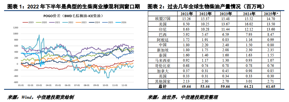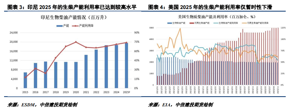 2022年6-12月,生柴商业掺混利润窗口也曾打开过,彼时印尼及美国的大幅增产带动全球生柴产量增长300多万吨,但我们预计今年商业掺混带来的油脂需求增量难有那么多。这些年美国及印尼政策性掺混大幅增长,令其生柴闲置产能减少,对生柴的商业掺混增量带来约束。2022年印尼实施的是B30,对应的生柴产能利用率仅60%左右,但2026年B40的推进令其增至75%以上。美国近些年生柴产能扩张虽然厉害,但若预期中的55亿加仑生柴掺混义务及70%豁免重新分配的预期得以兑现,产能利用率也有望大幅增至85%以上。此外,霍尔木兹海峡封锁导致东南亚甲醇供应问题,影响一代生柴的原料供应,也可能限制生柴工厂的生产活动。