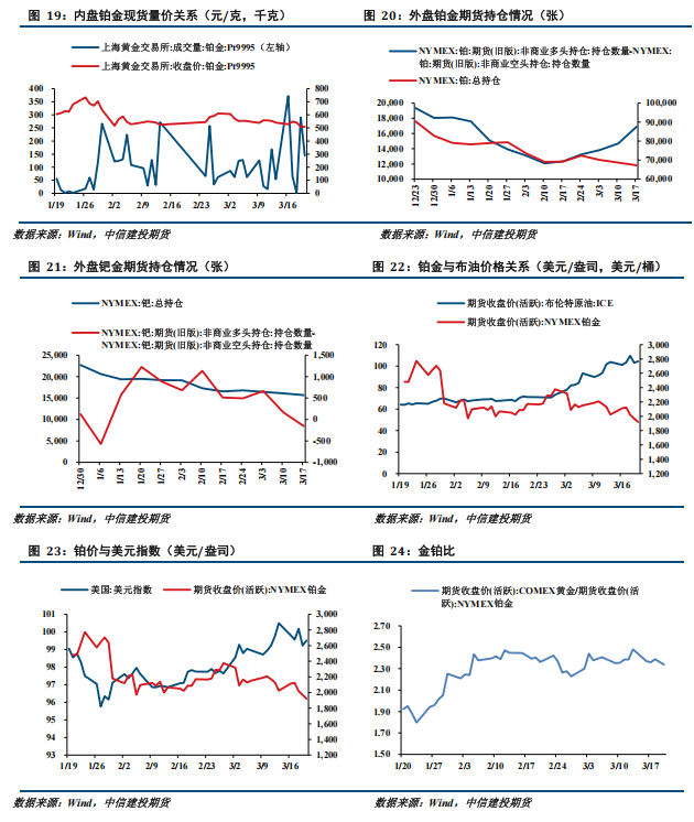 | 一、行情回顾 本周贵金属持续回调,金银钯跌幅显著,铂金相对抗跌,市场主要仍受伊朗局势带来的供应链担忧,以及美联储降息预期趋弱形成的强美元压制,全球资本市场均因流动性风险担忧而承压。 二、价格影响因素分析 1、宏观金融 周内贵金属全线下行,黄金白银跌幅超10%,钯金一度跌破1500美元,铂金相对抗跌。中东动荡未有减弱迹象,且战火波及中东多国油气设施,能源缺口担忧持续加剧,支撑强美元趋势压制贵金属。同时全球多国央行因“原油-通胀”担忧,利率决议均维持利率不变,年内降息预期大幅受挫,令贵金属持续承压。此外,全球权益市场周内均有所下挫,对流动性风险的担忧亦引导贵金属持续下行。总体而言,强美元、降息预期走弱与流动性担忧三者共振促成本周贵金属跌势。 美国经济数据方面,通胀担忧再升温,劳动力市场总体平稳,市场下调降息预期。美国至3月14日当周初请失业金人数20.5万人,前值21.3万人。美国2月生产者价格指数(PPI)环比上涨0.7%,预期值为0.3%,前值为0.5%;同比涨幅达到3.4%,创下一年来新高,预期值为2.9%。3月19日,美国1月新屋销售总数年化58.7万户,预期72万户,前值74.5万户。联储动向方面,3月FOMC会议维持利率不变,多重不确定性叠加令美联储对利率路径抉择更为谨慎。3月FOMC会议美联储将政策利率维持在3.5-3.75%区间符合预期,但鲍威尔表态更为谨慎,表示中东冲突对美国通胀的影响存在较大不确定性,且认为当下的通胀已居高位,因此未来应结合经济数据考虑是否对货币政策立场进行调整,引发市场对年内降息预期的大幅下调,“降息交易”叙事有所松动,叠加多国央行纷纷跟随维持利率不变,对贵金属价格形成较强压力。 地缘方面,伊朗冲突未有减弱迹象,战火波及中东能源基础设施,叠加美国海峡护航联盟计划遇冷,原油供应担忧暂未缓释。本周伊朗最高国家安全委员会秘书拉里贾尼遇袭身亡,伊朗方面对美以强化报复,打击沙特卡塔尔等美方炼油区域,全球对原油缺口担忧进一步升温压制贵金属价格。而美国的霍尔木兹海峡护航联盟计划遇冷,各国反应冷淡,海峡解封短期内希望有限。 总体而言,伊朗冲突导致的原油供给紧张预期尚未缓释,叠加通胀担忧引发的降息预期走弱,强美元对贵金属压制居高不下。 2、持仓分析 截止2026年3月20日,SPDR 黄金 ETF 持有量为1056.99吨,较上周周变化14.57吨,截止2026年3月17日,COMEX 黄金非商业多头净持仓为159869张,较上周减少3263张。 截止2026年3月20日,SLV 白银 ETF 持有量为15248.91吨,较上周周变化211.27吨,截止2026年3月17日,COMEX白银非商业多头净持仓为21881张,较上周减少2697张。 截止2026年3月17日,NYMEX铂金非商业多头净持仓为16898张,较上周增加2208张。截止2026年3月17日,NYMEX钯金非商业多头净持仓为-185张,较上周减少29张。 策略 周末伊朗方面声称非敌对国家油轮可通过霍尔木兹海峡,但需与伊朗就安全问题进行协调,原油供给担忧有部分缓释。但美国亦声称将派遣地面部队进入伊朗,计划夺取伊朗原油出口枢纽哈尔克岛,伊朗冲突不确定性仍存,原油供给紧张对贵金属短期压力亦难消解,近期贵金属价格大幅波动风险需持续关注,但美国滞胀风险对贵金属的长线支撑逻辑稳固。 操作上,短期观望为主,待市场企稳再考虑布局多单。沪金2606参考区间950-1100元/克,沪银2606参考区间15000-19000元/千克,广铂2606参考区间450-520元/克,广钯2606参考区间320-390元/克。 三、相关图表
