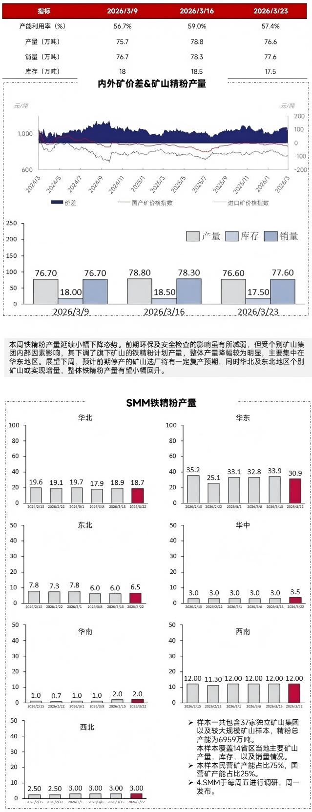 | 报告品种:铁矿石 原文链接:https://mp.weixin.qq.com/s/XLqOtL6ZInrwgeFqNTR3BQ 根据SMM最新统计,本周国内矿山整体产能利用率为57.4%,较前一周下降1.6个百分点;铁精粉产量76.6万吨,环比减少2.2万吨。与此同时,矿山精粉库存小幅去化1万吨,当前维持在17.5万吨左右。 本周铁精粉产量延续小幅下降态势。前期环保及安全检查的影响虽有所减弱,但受个别矿山集团内部因素影响,其下调了旗下矿山的铁精粉计划产量,整体产量降幅较为明显,主要集中在华东地区。展望下周,预计前期停产的矿山选厂将有一定复产预期,同时华北及东北地区个别矿山或实现增量,整体铁精粉产量有望小幅回升。