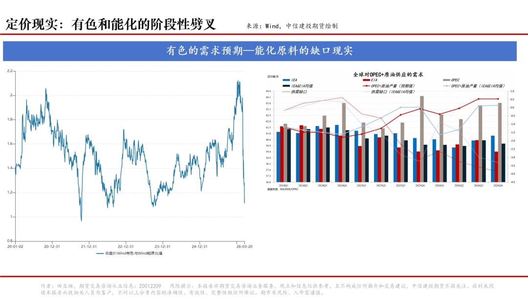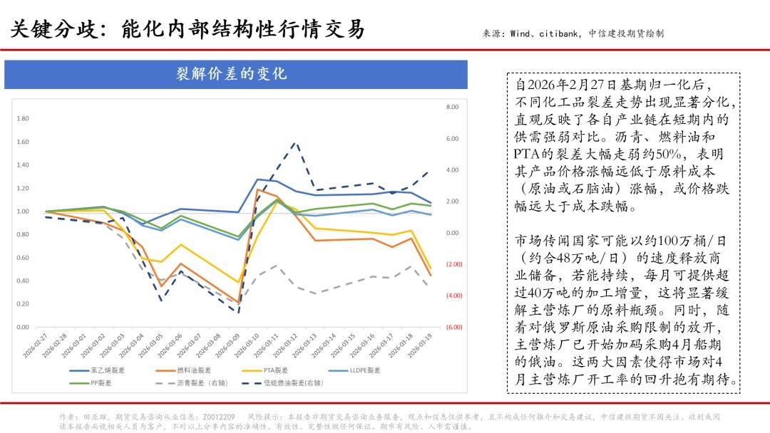 除能化板块外,近期黑色商品中的焦煤明显受到外溢的利多定价,背后驱动是能源的替代逻辑,即油气价格高企令煤化工经济性凸显,进而抬升后续煤炭需求预期,与之类似的高能耗商品(例如双硅)均有望共享这一逻辑。进一步延伸,地缘叙事亦会沿着能源、化肥等链条向农产品传导,例如与乙醇联动的ICE原糖、CBOT玉米、与生物柴油联动的CBOT豆油、BMD棕榈油等。最后,在此过程中,有色商品表现或相对偏弱,因其需求叙事主要与经济预期相关,而经济预期又与AI投资落地紧密联系。而基于当前宏观层面存在滞胀或者衰退的场景讨论,有色商品需求预期可能面临阶段性衰减,进而“空有色多能化”的路径短期有望延续。