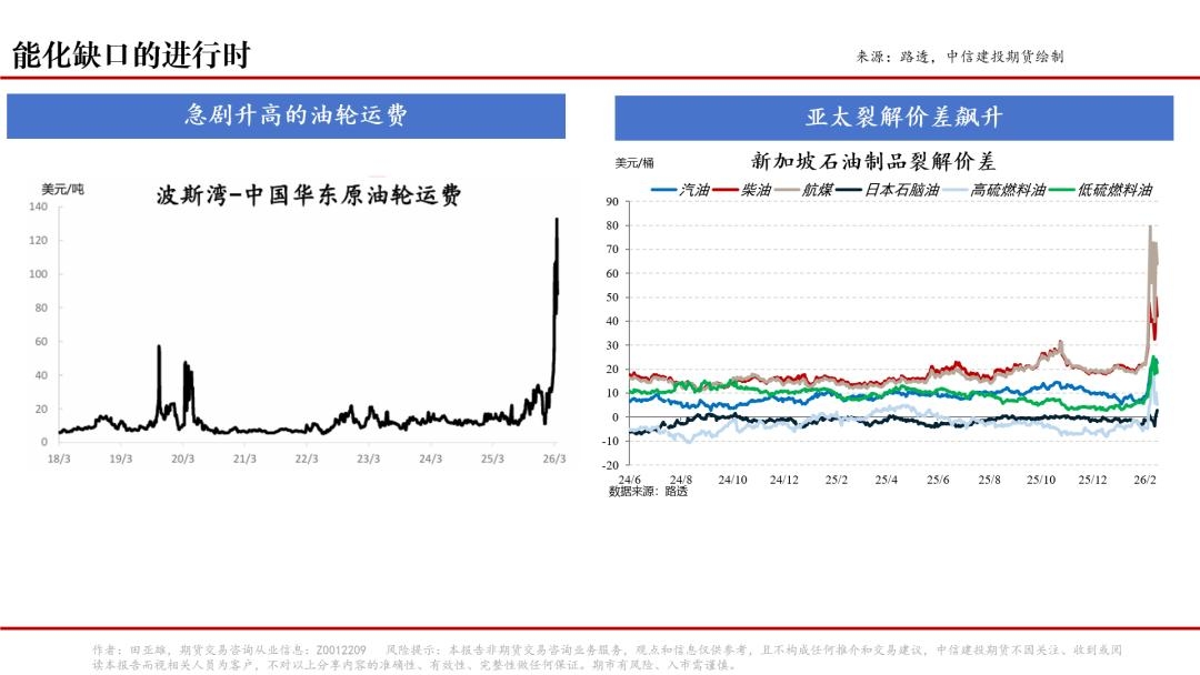 产业视角直面“物理缺口”的现实冲击。产业参与者直接承受供应链中断的切肤之痛,其感知基于无法绕开的三个物理现实:一是物流与成本巨变。霍尔木兹海峡的“功能性关闭”导致全球约20%的石油贸易受阻。油轮运价(TCE)在冲突爆发后一周内飙升131%,战争险费率从船舶价值的0.01%-0.05%跳涨至0.5%,一艘超大型油轮(VLCC)的单次通行保费从5万美元暴涨至75万美元。集装箱航线也出现剧烈调整,部分船公司对波斯湾航线征收每箱高达1500-1800美元的战争风险附加费;二是供应实质性中断。不止是航运停滞,海湾国家的能源设施也遭袭减产。沙特阿美、卡塔尔能源公司等巨头相继宣布遭遇“不可抗力”,全球石油供应面临高达800万桶/日的巨大缺口。化工产业链上游的石脑油、乙烯等原料出现区域性严重短缺,直接导致下游装置降负;三是月差结构反映紧迫性。近月合约相对远月合约的溢价(Backwardation)结构走强,产业看到的不是预期,而是正在发生的、用真金白银支付的供应缺口和物流瘫痪。 金融视角则更加聚焦复杂的宏观叙事与尚未到来的“衰退交易”。一方面,期限利差未现衰退信号。典型的衰退交易通常表现为长端利率因增长预期悲观而快速下行,导致期限利差(如10年-2年美债利差)收窄甚至倒挂加深。当前情况是,短端利率因降息预期回落,但长端利率受制于庞大的财政赤字、发债压力及期限溢价上升而保持刚性,期限利差在地缘冲突后甚至有所回升。这表明债券市场尚未将“深度衰退”作为基准情景。另一方面, 资产表现指向“通胀与风险溢价”。金油比(黄金价格/原油价格)从年初的85附近快速跌至55以下。这一背离显示,资金更倾向于交易由供应冲击驱动的再通胀和风险溢价,而非涌入黄金进行纯粹的避险。油价破百而黄金承压,背后是市场在定价“高油价推升通胀→延缓降息→实际利率维持高位”的逻辑链条。 历史经验表明,金融市场的情绪和叙事可以暂时偏离基本面,但物理世界的硬约束终将传导并重塑金融定价,我们大致从三个层面展开:一是成本推动型通胀的必然性。飙升的运费、保费和能源成本是实实在在的企业成本,必将逐级传导至终端消费品价格,强化通胀粘性。这会使央行在“抗通胀”与“防衰退”之间更加左右为难,延长高利率环境。二是供给冲击的持续性。关键海峡的关闭、核心能源设施的损毁,其修复非一日之功。即使冲突缓和,供应链的重建和信心的恢复也需要时间。持续的供给约束将不断消耗全球库存,从物理层面支撑大宗商品价格。三是从“通胀交易”到“滞胀交易”的潜在路径。如果高成本持续侵蚀企业利润和居民实际收入,最终拖累全球经济增长,而通胀因供给因素居高不下,那么金融市场当前交易的“再通胀”就可能被迫转向更令人担忧的 “滞胀” 。届时,衰退交易才会真正登台。 综合来看,产业端看到的月差陡峭、运费飙涨、保费天价、装置停产,是当下正在发生的“现实”。金融市场的复杂叙事(通胀Vs衰退)尚在摇摆。然而,“物理缺口”的深度和广度,很可能最终迫使金融定价向产业现实收敛。只要地缘冲突导致的供应链中断持续,大宗商品价格的上行压力和波动性就难以消退,而真正的“衰退交易”或许会被一再推迟,直到成本冲击彻底侵蚀掉总需求。在这场博弈中,紧盯实体物流数据与产业库存变化的产业视角,或许比追逐宏观叙事切换的金融视角,更能接近真相。 而在对于地缘事件本身的跟踪上,我们注意到近期地缘局势有部分升级的可能,首先是战略目标升级。双方从军事打击转向国家基础设施瘫痪。冲突已进入“国家基础设施对等威慑”的新阶段。美国方面,特朗普政府公开提出48小时最后通牒,要求伊朗开放霍尔木兹海峡,否则将打击其国家电力系统,这标志着打击范围从能源出口节点(如油轮、港口)直接升级至全国性民生基础设施。伊朗则回应称,将把报复范围扩展至美国及其盟友的能源设施、信息技术系统及海水淡化设施。双方的行动逻辑正从传统的军事能力削弱,转向旨在造成对方社会与经济系统瘫痪的“威慑对抗”。 其次是战术意图升级。出现“占领关键节点”的地面介入可能。美国正在评估占领或封锁伊朗哈尔克岛的方案。该岛承担伊朗约90%的原油出口,此前美军虽对其军事目标进行过空袭,但未触及核心油气设施。评估“占领”方案,意味着美国的战略意图可能从施加压力转向直接控制伊朗的能源命脉,一旦实施,将意味着冲突级别发生跃迁,并可能引发地面战斗。 再次是地理范围升级。打击范围首次跨出中东区域,伊朗已向位于印度洋的英美迪戈加西亚基地发射弹道导弹。该基地是美英重要的战略投送与核力量部署点,距离伊朗约2000-2500英里。尽管报道称导弹未命中目标,但此举标志着伊朗首次展示并实施了跨战区远程打击能力。冲突的影响范围已不再局限于中东,开始向印度洋等全球战略要地外溢。 最后是打击对象升级。冲突的打击链条正在延长和扩大。继以色列打击伊朗南帕尔斯气田后,伊朗对海湾合作委员会国家的能源设施进行了反击,卡塔尔、阿联酋、科威特的相关设施均受到影响。例如根据卡特尔官方报告,卡特尔最大的LNG的出口基地拉斯拉凡综合设施遭到袭击,导致14条液化生产线中的两条严重受损,某种意义上出口陷入瘫痪。 在此背景下,能源市场的定价出现