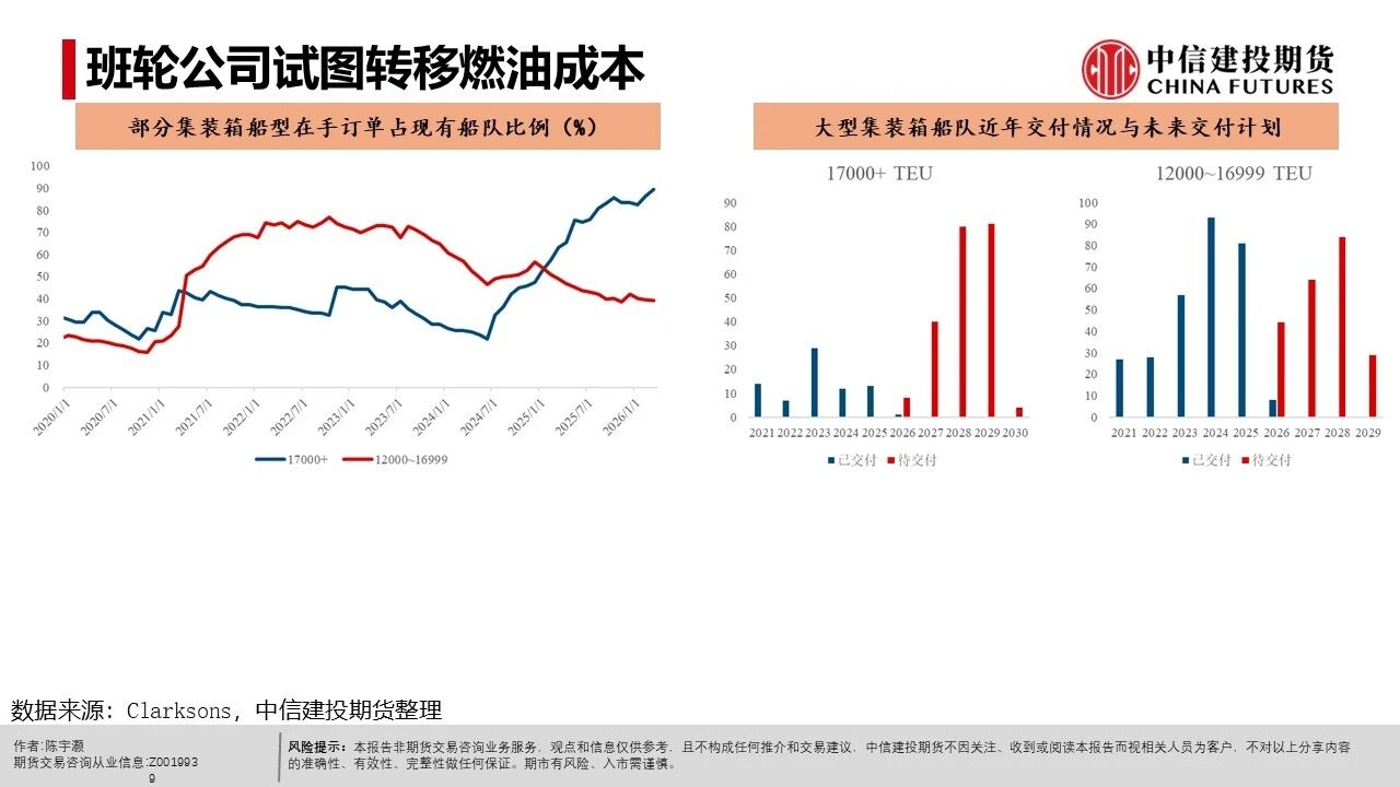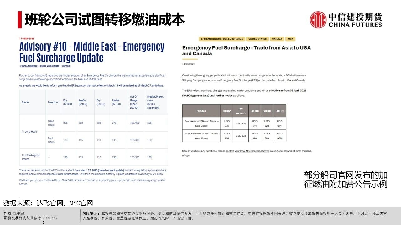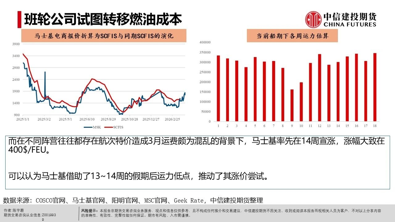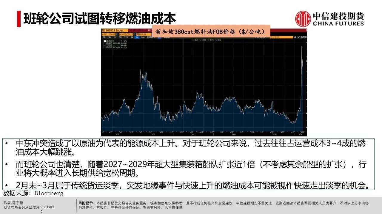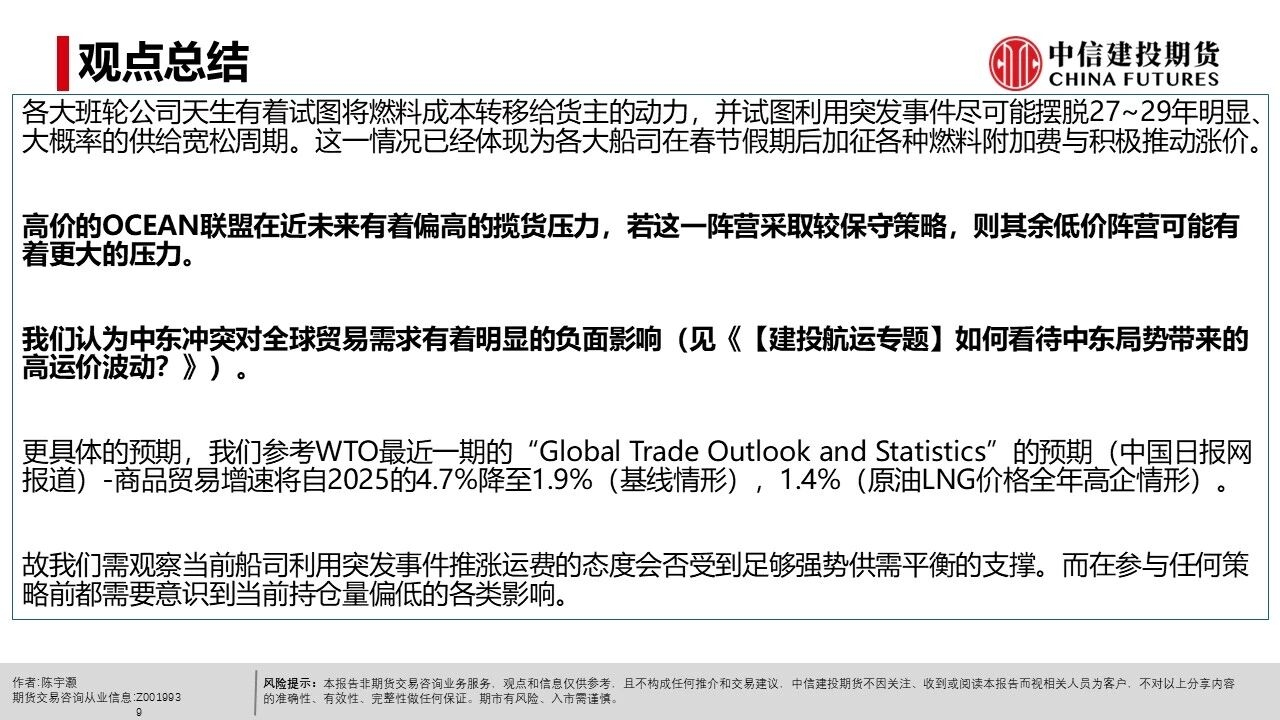 | 中东冲突造成了以原油为代表的能源成本上升。对于班轮公司来说,过去往往占运营成本3~4成的燃油成本大幅跳涨。 而班轮公司也清楚,随着2027~2029年超大型集装箱船队扩张近1倍(不考虑其余船型的扩张),行业将大概率进入长期供给宽松周期。 2月末~3月属于传统货运淡季,突发地缘事件与快速上升的燃油成本可能被视作快速走出淡季的机会。 而在不同阵营往往都存在航次特价造成3月运费颇为混乱的背景下,马士基率先在14周宣涨,涨幅大致在400$/FEU。可以认为马士基借助了13~14周的假期后运力低点,推动了其涨价尝试。 达飞在4月新增一条自营的OCEAN RISE EXPRESS航线(8000~10000teu的船只),挂靠华南的厦门、盐田港。 参考各船司官网,4月停航有限,而对于有停航的OCEAN联盟来说,自中东返回的CSCL GLOBE(更早)与COSCO SHIPPING AQUARIUS基本能在4月中旬左右回到我国港口。类似背景的CSCL ATLANTIC OCEAN与COSCO SHIPPING PLANET也投放至欧线。 故传统高价的OCEAN联盟可能在近未来有着较高的揽货压力。若这一阵营在定价上较为保守(例如新增自营航线报价低于3月末水平),则可能给低价阵营带来更大的揽货压力。 各大班轮公司天生有着试图将燃料成本转移给货主的动力,并试图利用突发事件尽可能摆脱27~29年明显、大概率的供给宽松周期。这一情况已经体现为各大船司在春节假期后加征各种燃料附加费与积极推动涨价。 高价的OCEAN联盟在近未来有着偏高的揽货压力,若这一阵营采取较保守策略,则其余低价阵营可能有着更大的压力。 我们认为中东冲突对全球贸易需求有着明显的负面影响。 更具体的预期,我们参考WTO最近一期的“Global Trade Outlook and Statistics”的预期(中国日报网报道)-商品贸易增速将自2025的4.7%降至1.9%(基线情形),1.4%(原油LNG价格全年高企情形)。 故我们需观察当前船司利用突发事件推涨运费的态度会否受到足够强势供需平衡的支撑。而在参与任何策略前都需要意识到当前持仓量偏低的各类影响。