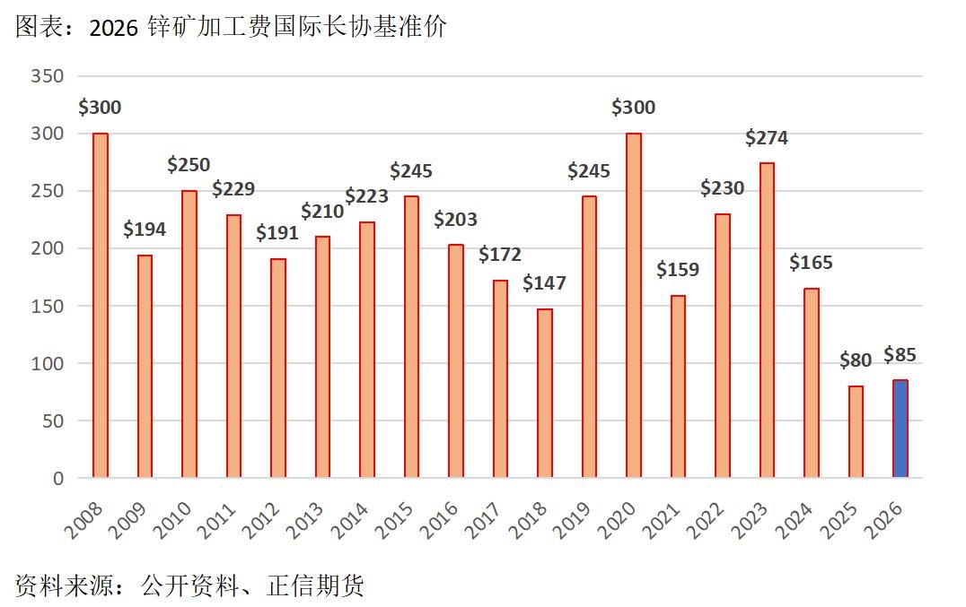 | 在有色板块整体回调和高库存的双重打击之下,锌价近期跌破震荡区间,下探至23000元/吨下方。中东局势大幅推升油价及通胀预期,美联储降息路径受阻,贵金属及有色板块回调;库存压力是锌价下跌的另一原因,一季度炼厂延续增产但需求平淡,库存累库幅度明显高于往年同期。2026年全球锌基本面基调为过剩预期缓慢兑现,锌价中枢抬升的阻力较大。此外,预计国内精炼锌过剩程度高于海外,沪伦比将持续承压,关注精炼锌出口窗口开启的时机。 一、2026年加工费长协基准价微幅上调,原料”紧“基调未变