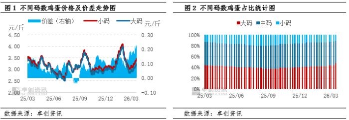 | 【导语】前鸡蛋尺码价差明显拉大,核心在于蛋鸡鸡龄结构失衡。整体存栏偏高,但中小日龄新开产鸡数量下降,小码蛋供给紧张,反映后备产能薄弱;高龄存量鸡偏多,大码蛋充裕拖累整体蛋价。饲料成本持续上行,养殖陷入亏损,或刺激养殖户由惜淘转为理性淘汰,叠加前期补栏低迷、新增产能有限,预计二季度蛋鸡去产能节奏或将加快。 鸡蛋尺码价差持续拉大,供应结构失衡凸显 当前鸡蛋市场尺码分化加剧,小码蛋与大码蛋价差从2025年四季度不足0.10元/斤逐步攀升至目前0.21元/斤。价格波动的背后是供应变化的支撑,根据卓创资讯监测数据显示,小码蛋市场占比逐步下滑,由2025年四季度15%以上降至当前10%左右。尺码供需错位并非单纯流通端差异,而是蛋鸡存栏鸡龄结构失衡的直接体现,成为研判行业产能周期的重要信号。截至2026年2月,全国在产蛋鸡存栏量约13.5亿只,环比上涨0.60%、同比上涨3.37%,绝对存栏量仍处于近五年同期偏高水平,但鸡龄结构呈现“中间厚、两头薄”的特征,导致大小码鸡蛋供应分化。(价差=小码鸡蛋价格-大码鸡蛋价格)