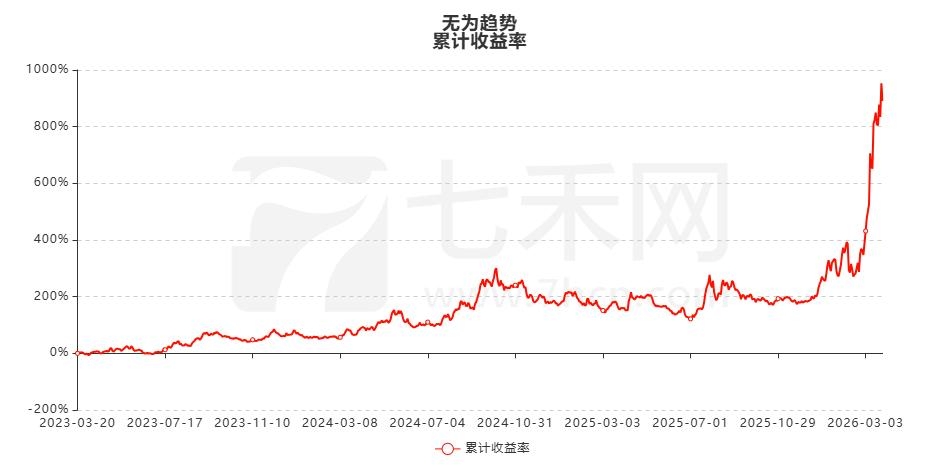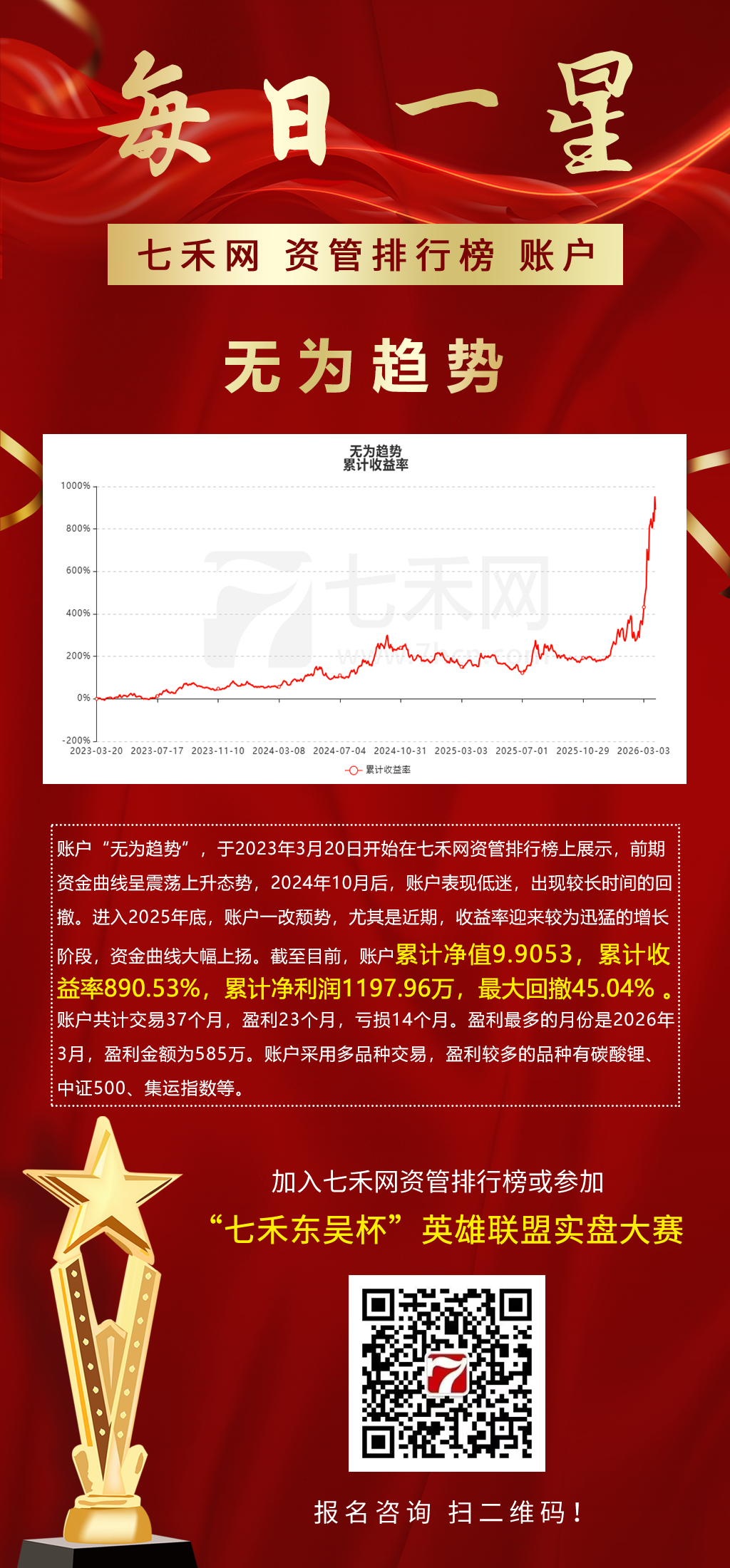 账户“无为趋势”,于2023年3月20日开始在七禾网资管排行榜上展示,前期资金曲线呈震荡上升态势,2024年10月后,账户表现低迷,出现较长时间的回撤。进入2025年底,账户一改颓势,尤其是近期,收益率迎来较为迅猛的增长阶段,资金曲线大幅上扬。截至目前,账户累计净值9.9053,累计收益率890.53%,累计净利润1197.96万,最大回撤45.04% 。