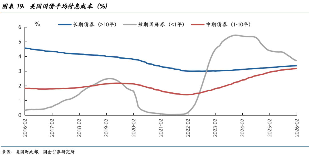 四、中东战争是美国综合国力由盛转衰的标志,酝酿黄金新一轮大牛市 美伊战争短期内并未结束,甚至演绎成长期化,于美元信用不利。 第一,从美国此次战争的影响力来看,不但北约成员国等响应力非常有限,且美国面对一个被经济制裁长达四十年的对手,没有显示出军事上压倒性的优势,甚至在一些领域遭到了非对称打击和消耗。短期内,特朗普不仅没能实现颠覆伊朗现有政权的军事目标,也没能有效保护其海湾国家盟友,甚至自身处在一个进退两难的尴尬局面中。如果不能漂亮地获胜,对美国就等于失败,美国会丧失一部分中东地缘影响力,以及建立在军事实力之上的美元霸权。 第二,伊朗的反制措施——封锁霍尔木兹海峡,长期来看可能破坏“石油—美元”链条。过去几十年中,海湾国家通过霍尔木兹海峡运输石油出口赚取美元,再投向美股和美元资产获取收益,但该链条当前遭遇了前所未有的未知性。若美国迟迟未能以控制海峡或其他方式夺回原油的定价权,将降低美元资产对中东资金的吸引力。 第三,利率上升还阻碍到特朗普第二任期的最核心议题——化债大计。截至2026年2月底,美国存量长期国债的平均付息成本为3.38%,较一年前上升了0.14个百分点,高利率的滞后效应仍在显现。若美国因战争扩大军事开支,进而加速财政失序扩张,美元信用的褪色终会被市场计价。