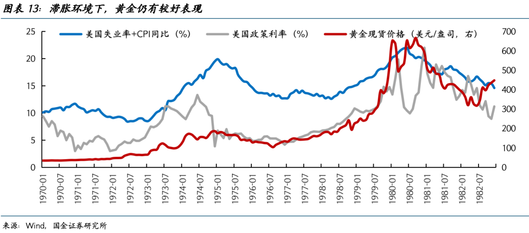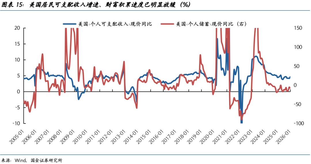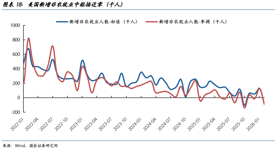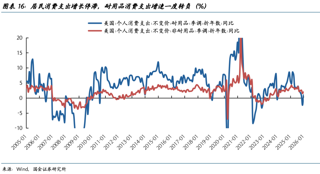 三、衰退交易可能是黄金反弹的起点 从上世纪70年代两次石油危机的经验来看,当经济陷入滞胀环境(高CPI增速+高失业率),即便政策利率相应抬升,黄金依然总体趋势上涨(图表13)。世界黄金协会的资金流数据统计也显示,当市场滞胀预期上升时,市场对于黄金的平均需求为正(图表14)。本轮市场在剧烈的预期修正中集中定价“涨”,却忽略了“滞”的压力,因此黄金阶段性出现了大幅回撤。 但也需注意到,当前美国经济增长乏力,高油价或加速衰退的到来。不同于2020-2021年的滞胀环境,彼时美国为应对疫情推出的超大规模财政与货币刺激,积累了过剩的私人部门购买力,这与后来的俄乌冲突一道,从供给侧和需求侧共同推高了通胀,形成了更强烈的加息预期。 现如今,尽管有AI相关投资的支撑,但中下层居民的痛苦并不能被AI投资所掩盖。今年1月,美国私人耐用品消费支出增速回落至1%(图表15、16)。2025年前三季度,AI相关产业对实际GDP增长的贡献率达到37%,高于2024年同期水平,同期实际GDP增长率为2.1%,但若剔除AI产业贡献,仅为1.5%。 就业市场也存在更大的下行风险。2022年3月,美国每一个失业人口对应2.03个空缺岗位,如今已经低于1个(图表17),失业率也较2022年高出近一个点。2022年非农就业平均每月增加37.7万人,去年6月至今则平均每月减少3600人(图表18)。此外,AI可替代的低技能岗位裁员风险也持续存在。 可以说,在美伊战争前,美国经济已经露出“滞”的迹象。在此背景下,高油价引发供给冲击,再导致运输、物流等领域供应链成本上涨,企业利润压缩、工厂停工、工人失业,则美国居民购买力可能进一步下降,衰退将更快到来。 这一情景下,即便油价居高位,美联储仍可能重新评估衰退风险,并思考增量流动性的必要性。经济停滞和资本市场下行的两重逆风下,不排除美联储重新降息或者扩表救市的可能性。这种因衰退导致的流动性预期差,可能使一部分黄金投机客重返市场。
