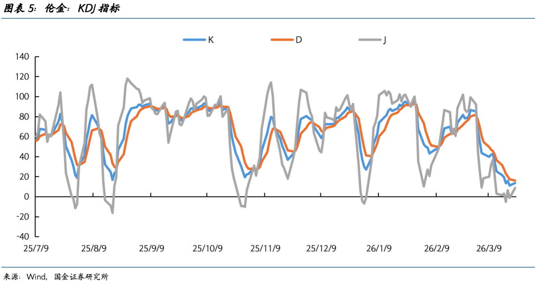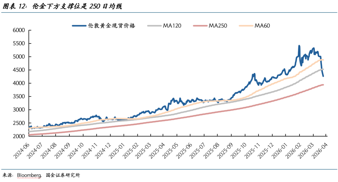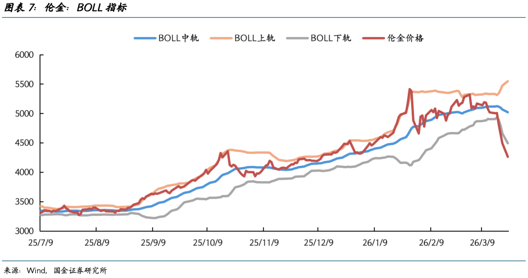 二、短期谨慎为上,静待波动率企稳 短期内,黄金大多技术性指标均已显示超卖,但反转趋势尚不明确。截至3月23日,伦金RSI已跌至21.1的极端值(图表6),但并未出现底背离信号;K、D、J值分别为13.6、16.0、8.7,但尚未出现黄金交叉信号(图表5);价格延BOLL线下轨继续下探,且轨道开口变宽,或标志新趋势的开始(图表7)。 从波动率绝对水平看,黄金仍未脱离“高波”行情。即便价格已经大幅回调、兑现了大量波动率预期(IV-HV降低),黄金的隐含波动率(IV)仍在继续冲高(图表8),说明期权投资者对其未来价格路径不确定性的预期增加,仍待市场进一步消化。 拥挤度和金油比均显示黄金短期已经超调。截止3月23日,黄金的短期、中期交易拥挤度分别为0%、21.5%(图表9)。同日,金油比已回落至41,触及2020年8月第一轮剧烈修正的水平,距离长期中枢已不远(图表10)。 从跨资产的角度,黄金若能继续降波将重拾避险优势。3月以来,不仅是黄金,大类资产均朝着滞胀交易演绎,股票、债券波动率均在上升(图表11),现金资产的重要性不言而喻。但值得一提的是,过往高波动且对流动性极度敏感的资产代表——加密货币,本轮反而跌幅较小,或是因为之前经历了一轮降波行情,估值压力先一步释放。黄金在经历一段时间的降波行情后,或也能重新找回其“相对安全性”。 在4500点下方,4300点是今年金银阶段性冲高行情的起点,3900-4000点附近既是心理上的整数关口位,也是250日均线位,还是去年10月黄金回调时的支撑位(图表12)。在3900点下方,3400-3500点附近是去年8月鲍威尔货币政策转向的开始,也是本轮黄金开启主升浪的起点。
