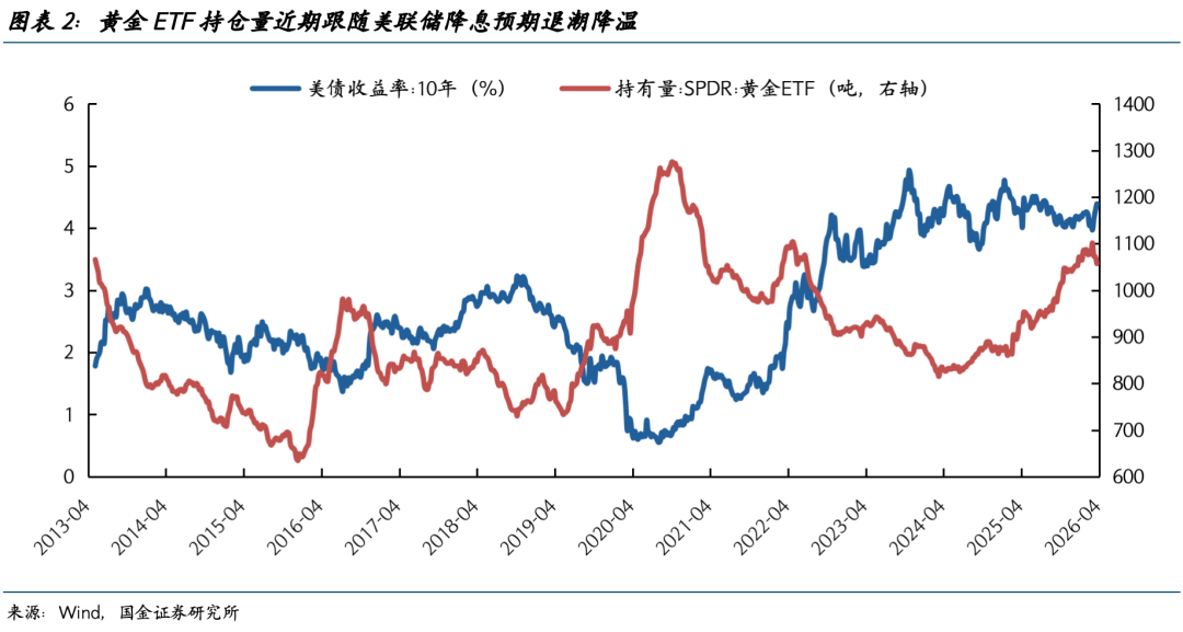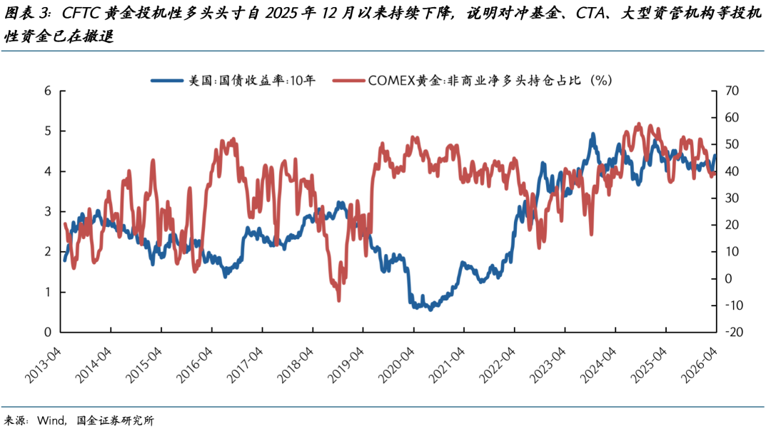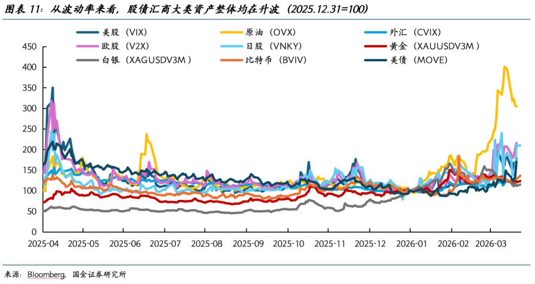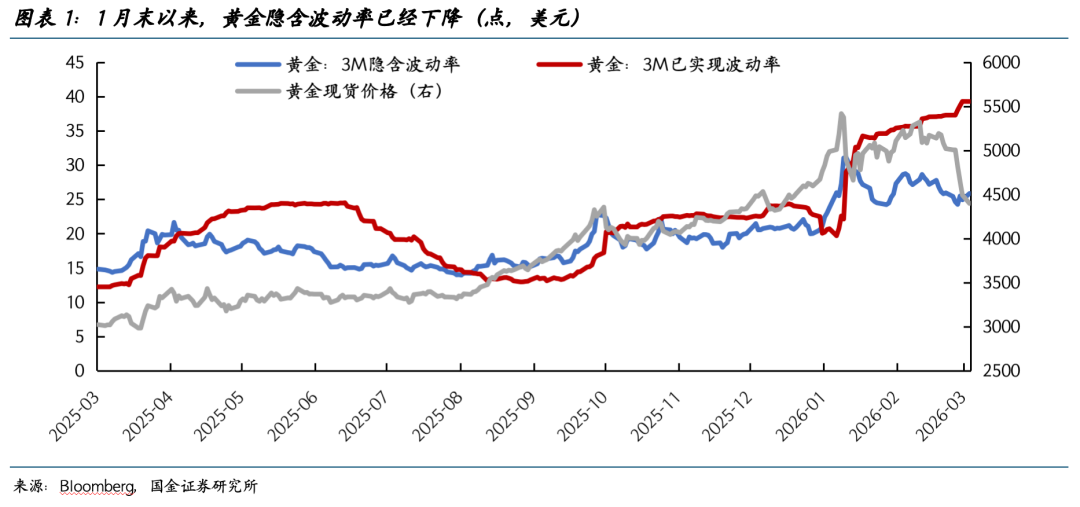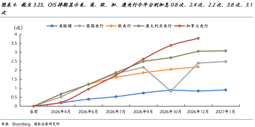 | 一、加息交易刺破黄金的投机泡沫 3月以来,黄金价格快速回调,不免让市场回忆起1月底的“沃什交易”,但1月底的调整是高拥挤度背景下,因远端缩表预期发酵导致的集中平仓。而本轮金价剧烈调整前,隐含波动率已脱离极端高点(图表1),宏观变量成为金价的主导。 本轮金价调整,起初是美伊战争爆发,石油和美元大幅走强引发的流动性紧缩预期。美国作为第一大石油生产国和石油净出口国,油价上升让美元相较于非美货币被动地获得了溢价。同时,来自中东和亚洲市场的避险需求也让离岸美元流动性收紧。之后,油价持续高位引发输入性通胀担忧,央行和期货市场修正利率预期,截至3月23日,隔夜掉期市场开始定价美联储年内将加息0.8次,英、欧、加、澳央行今年将分别加息2.4次、2.2次、3.8次、3.1次(图表4)。美债利率的上移,让黄金的投机客迅速撤退(图表2、3)。