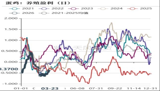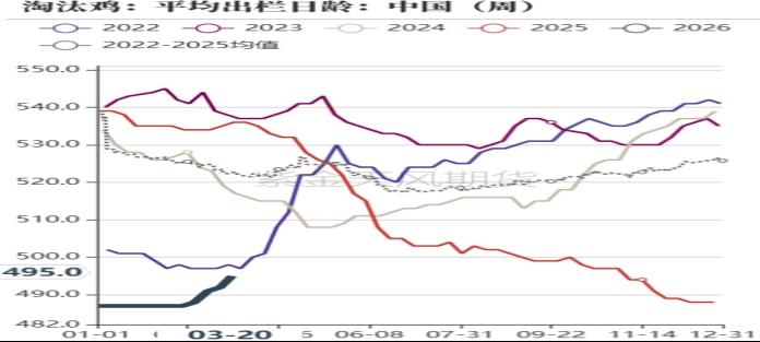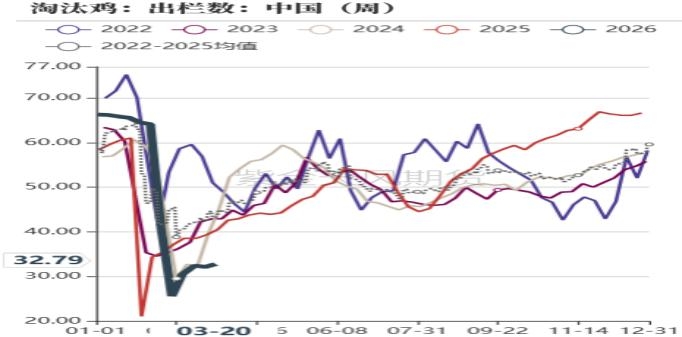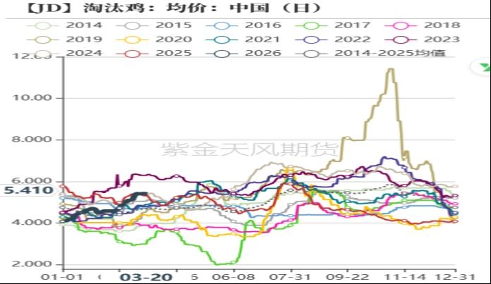 数据来源: 上海钢联 紫金天风期货研究所 3、养殖利润有所改善,淘鸡日龄环比增加 钢联数据显示截止3月20日当周,淘汰鸡出栏量32.8万只,环比增加2%,同比减幅20%;卓创数据显示,3月20日当周,淘汰鸡出栏量1540万只,环比增加22%,同比减幅8%;主产区淘鸡价格为5.25元/斤,周度环比减少0.1元/斤,但较春节之后上涨0.7元/斤;当周平均淘汰日龄495天,较前一周增加3天。3月之后现货价格持续偏强震荡,当日现货利润转正后持续回暖,基于对未来行情谨慎乐观,换羽以及延淘情绪较强,淘鸡量环比增幅低于去年同期,此外从淘鸡价格环比持续上涨来看,也反映了惜淘情绪加强。 截止3月24日,饲料价格为2.81元/斤,较上3月初上涨0.07元/斤;蛋鸡养殖利润为-0.32元/斤,较上周同期缩窄0.3元/斤。因饲料原料中的玉米价格持续反弹,养殖成本环比增加,但近期现货价格回暖幅度较大,因此养殖利润整体呈现回暖趋势。 图7:淘汰鸡月度出栏数(万只)