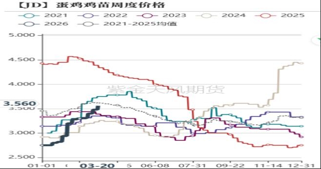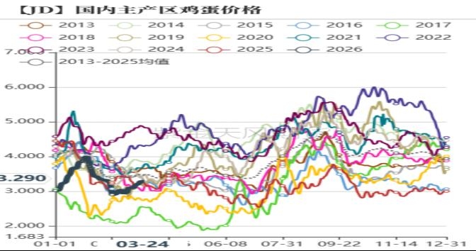 | 观点小结 3月以来,随着市场换羽比例增加以及新增产能较低,加上需求整体向好,市场供需宽松程度得到一定的缓解,现货价格持续走强,而随着现货价格走强以及大小蛋价差走扩,市场对产能缩减预期较为乐观,整体维持谨慎看涨情绪。 因1月现货价格反弹超预期,自1月起市场鸡苗补栏情绪较强,这两个月的鸡苗补栏量较去年下半年增加幅度较大,预期这波高补栏维持到6月份,后期补栏情况,主要看4月以及5月现货价格走势是否能稳定或超预期,以判定现阶段产能是存在阶段性偏紧,还是产能去化已经完成。此外近期现货价格表现来看,三方数据存栏量或许有些误差,但对中长期行情趋势有一定参考意义。 期货方面:即将进入交割月的JD2604合约逐步走期现回归逻辑,从小幅升水来看,市场对4月现货价格预期以稳定为主。3月中旬以来2605合约、2606以及2607合约的基差持续反弹,这主要是近段时间延淘以及换羽造成供应压力后移以及新增产能陆续恢复的担忧,可以看出市场对中长期行情是谨慎乐观的。现阶段鸡蛋二季度期货合约估值相对合理,短期或将继续维持看涨情绪,关注4月现货价格能否坚挺。中长期来看,基于换羽以及延淘情绪存在,现货价格若出现情绪化上涨,并致使期货盘面高估的情况下,可择机选择逢高布空的机会。 1、现货价格偏强震荡 上周以来中下游环节为清明节备货,市场需求量环比增加,中下游得以积极消化累积库存,加上供给端,特别是小码蛋供给偏紧,现货价格呈现偏强震荡。截止到3月25日,主产区鸡蛋均价为3.27元/斤,较上周同期上涨0.1元/斤,邯郸地区鸡蛋均价为3.16元/斤,较上周同期上涨0.1元/斤。 图1:鸡蛋主产区价格(元/斤)