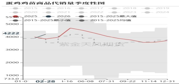 数据来源: 上海钢联 紫金天风期货研究所 2、在产存栏及鸡苗销量环比增加 钢联数据显示,2025年2月底在产蛋鸡存栏量约为12.96亿只,环比增加0.3%,同比增幅7.1%。卓创数据显示,2025年2月底在产蛋鸡存栏量约为13.5亿只,环比减幅0.6%,同比增幅4%。因市场对价格预期较强,延淘现象相对普遍,基于3月现货价格持续回暖,加上惜淘以及换羽的存在,预期3月在产蛋鸡存栏或将继续环比小幅增加。钢联数据显示全国2024年2月底鸡苗样本点销量4222万羽,环比增加7.7%,同比增加9.5%;卓创数据显示,2月鸡苗销量4330万羽,环比增加0.19%,同比减幅5.13%;晓鸣股份2025年2月销售2188万羽,环比减少4%,同比减少20%。因1月现货价格相对坚挺,加上市场对未来现货价格相对乐观,1月以来市场鸡苗补栏情绪大幅回暖。目前种鸡企业鸡苗订单多数排至5月中旬,少数派单至6月上旬,种蛋利用率在70%-80%,从企业排单量、补栏情绪以及市场调研来看,预期二季度月鸡苗补栏量依然较大。 图3:蛋鸡月度存栏量(亿只)