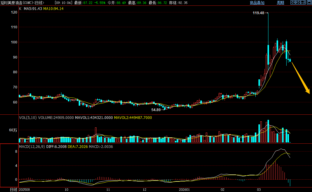 | 一、核心观点 本轮国际原油及国内能化板块期货的阶段性大幅上涨,核心驱动力为美伊地缘冲突引发的供应恐慌溢价,并非供需基本面实质性改善,且原油的情绪性上涨行情已结束。历史复盘显示,多数中东地缘事件后,原油风险溢价会在数周至3个月内快速回吐,回归供需基本面定价。当前市场核心逻辑已从“地缘危机博弈”转向“风险预期回落”,若美伊冲突逐步缓和、避险溢价完全消退,原油价格大概率呈现“怎么涨上去,怎么跌下来”的走势,回归自身供需基本面定价。 美原油连续日K线