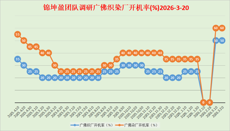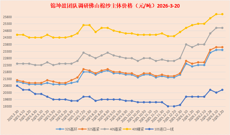 10、纺纱厂:新年开工二十多天,原材料棉花疯狂上涨,棉纱价格很难同步上调到位。纺纱厂实际交售,接订单非常有限。也不敢大量采购棉花,只能等待时机,逢低补库,刚需采购,随用随买。 11、出口:据海关总署统计报告,2026年1月份出口按人民币计,纺织纱线织物及其制品10021654万元,服装及衣着附件9751422万元,对比去年同期,分别增加-7.1%,-9.2%。 12、国内需求:全国两会总理政府工作报告,明确提出2026年突出做强国内大循环,持续扩大内需,优化供给,着力稳企业,稳市场,稳预期,纵深推进全国统一大市场建设;中央多部门密集出台相关金融财政政策,2026年内销市场值得期待。 13、棉纱价格:原材料棉花期现货频繁波动,带动棉纱价格不断调整,经过多轮微调,整体维持前期价格。当前佛山市场现金含税主流报价,国产牌子货纯棉32支高配环纺23200~23400元/吨,纯棉32支高配紧密23400~23600元/吨,纯棉40支高配紧密24700~25000元/吨,纯棉40支精梳紧密25700~26000元/吨,进口一线纯棉10支赛络散货20500元/吨,整柜优惠100元/吨。