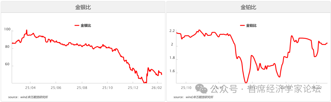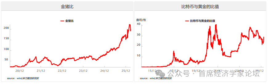 金猪比方面,黄金与生猪的比价映射民生消费与避险情绪的博弈。近期金猪比在历史高位区间略有下降,反映黄金避险溢价与生猪周期压制的博弈出现边际变化。当前金猪比仍处绝对高位,意味着宏观弱复苏下资金偏向避险资产的核心逻辑未改,生猪价格受能繁母猪去产能、消费疲软的压制仍在;而近期比值小幅回落,一方面源于黄金在高位获利了结后阶段性震荡,另一方面则是猪价随周期预期修复出现边际抬升,市场对经济复苏与民生消费的信心略有回暖。后续若猪周期持续反转、消费进一步回暖,金猪比将向合理区间稳步回落;若猪价上涨推升通胀预期但未触发货币收紧,则黄金与猪价或形成阶段性正向联动,推动金猪比再度走高。 比特币与黄金的比值方面,在2025年冲高至35-40盎司/枚区间后持续回落,近期在20-25盎司/枚区间企稳反弹,整体仍处于历史中高位水平。这一走势反映出:在美联储降息预期、地缘风险等宏观驱动下,黄金与比特币的避险与投机属性此消彼长,前期比特币相对黄金的超额收益逐步收敛,而近期比值小幅抬升则体现出数字资产在风险偏好边际修复时的弹性优势,当前市场正处于“实物黄金锚定央行购金、比特币博弈减半行情”的再平衡阶段。